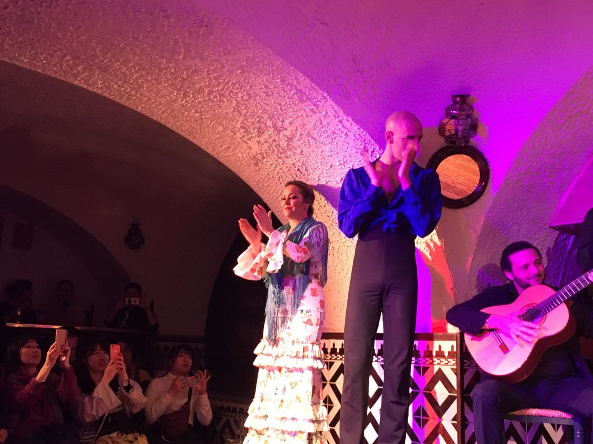 男性ダンサーと女性ダンサーの両方のフラメンコを楽しめます。観客にスペイン人がいると盛りあげポイントとかもわかっているようで、とても盛り上がりました。