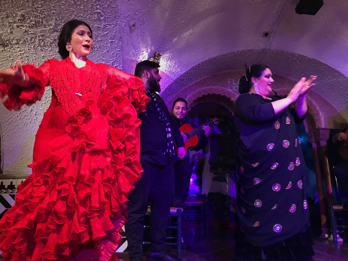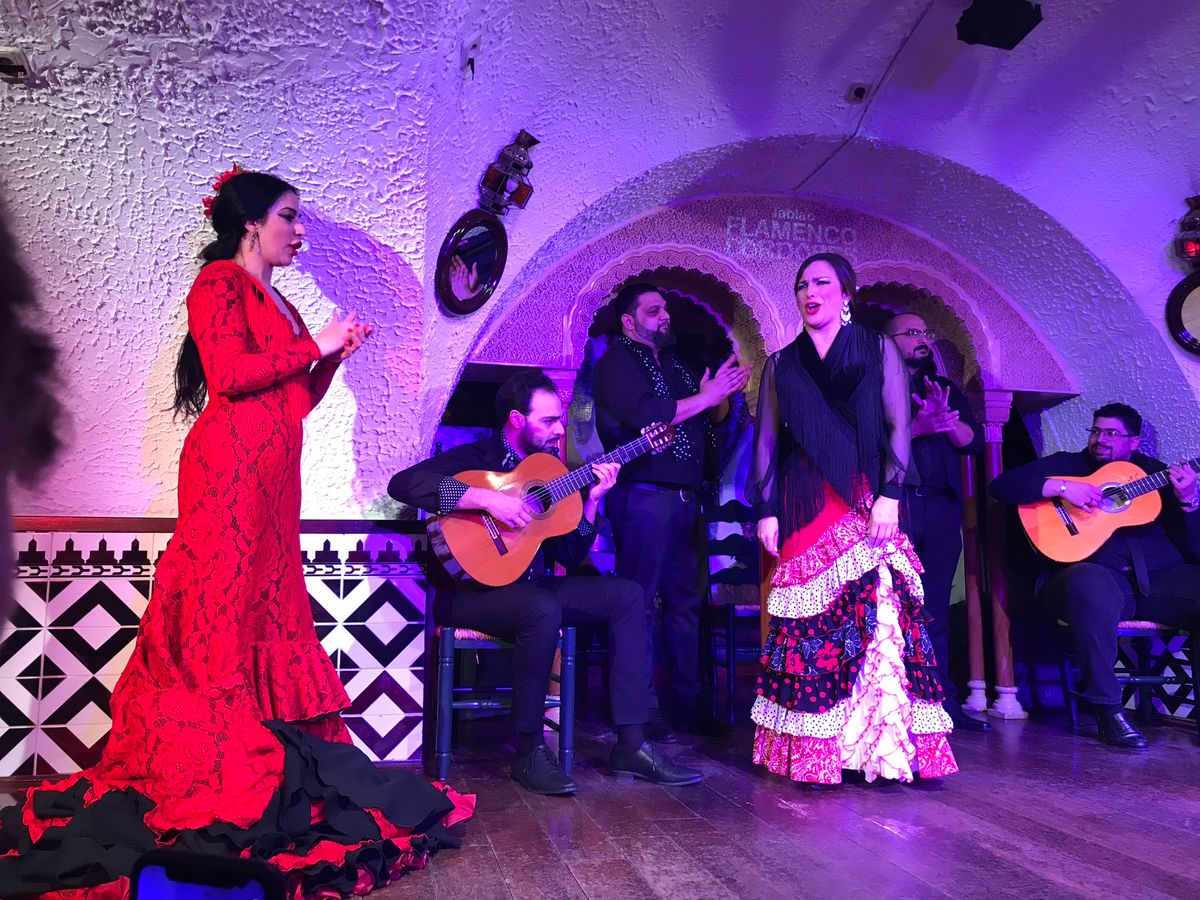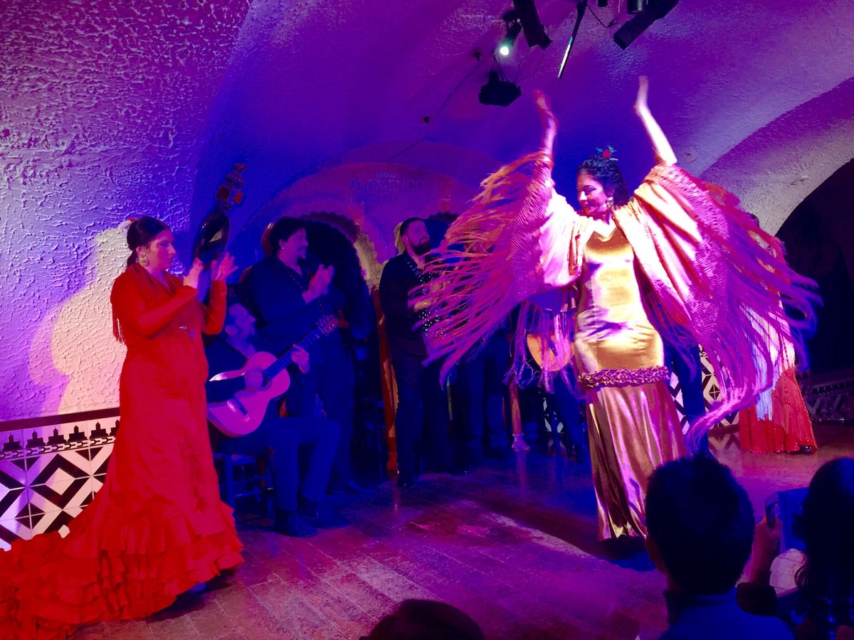ディナー付きのショーに参加しました。食事は、いろいろな種類があり、どれも美味しく満足できるものでした。フラメンコのショーは3人で参加したので、全体が見わたせる一段高い席を案内していただきました。フラメンコの踊りは期待以上の迫力、歌、ギターともにとても素晴らしいものでした。席が舞台に近いこともあり、心と体に響く感じがありました。