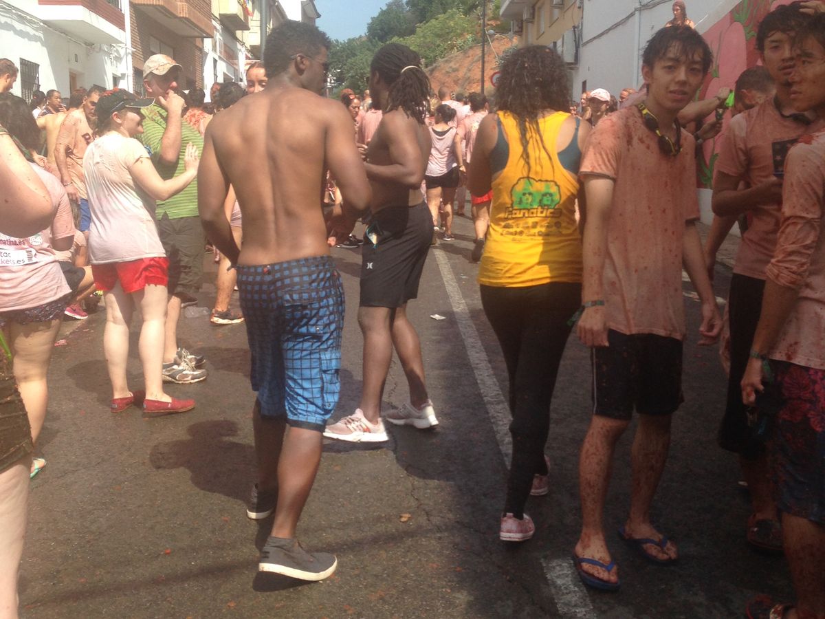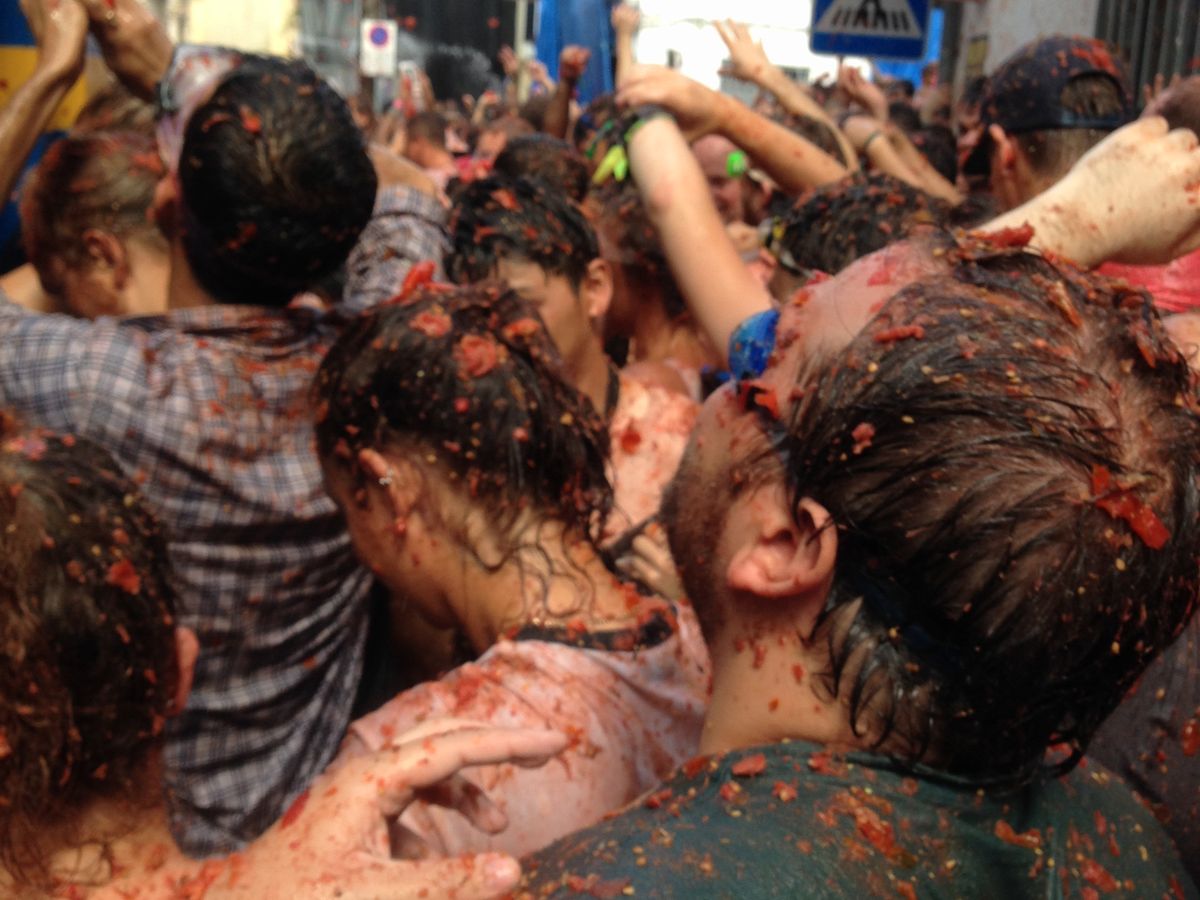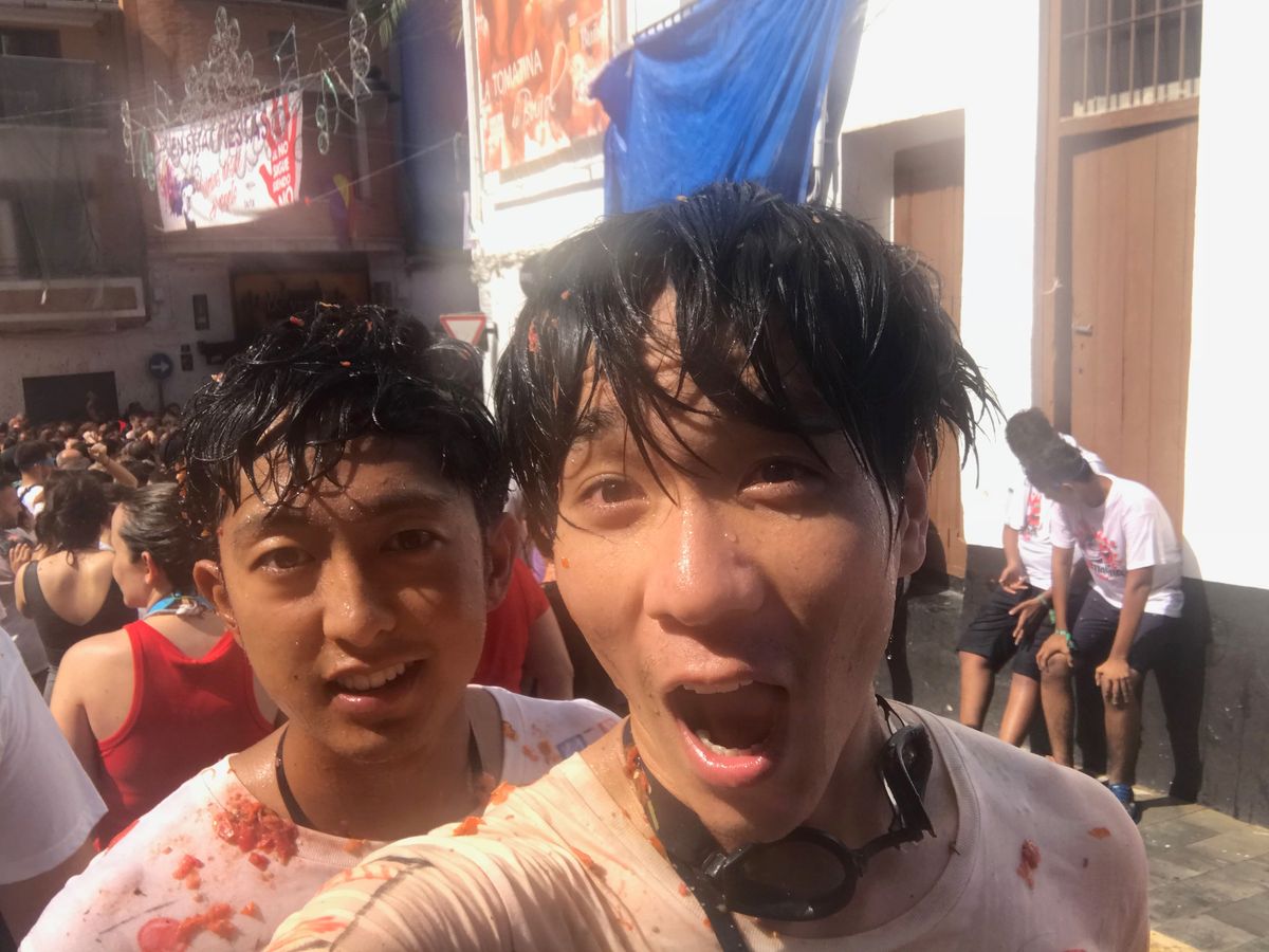 ツアー工程について説明すると、最初はバルセロナに開催日早朝に集合しました。そこから約6時間(休憩も含む)でブニョールへ到着します。そして、各自が貴重品だけ持ち祭り会場へ移動します。私たちは少量のお金とゴーグル、防水ケースに入れたスマホ、そして防水カメラを持って行きました。そして、トマト祭りの前座としてハムを木にくくりつけた、パロ・ハボン(石鹸棒)が行われていました。ここから会場のボルテージは上がって行きました!トマト祭り開催時刻になるとトマトを積んだトラックがやってきてスタートです。中心部に近づくほどトマトの投げ合いが激しくなります!私たちはその中へ飛び込んで行きました。人混みでトマトの飛んでくる方向がわかりませんでしたが、ゴーグルをつけていたことで、目は守れました(笑)しばらくしてから人混みから離れスマホで撮影した写真を投稿しました!防水ケースも必須です。もし忘れた場合でも会場の近くで販売していました。トマト祭り終了後の人が少なくなった時間はトマトにダイブすることもできました(笑)ツアーに同行していただいた日本人スタッフの方も終始優しく迅速に対応してくださり、安心感もありました。今回の祭りは、日本では経験できない貴重な経験になりました。是非、次回参加の機会があればこのツアーで参加したいと思います。