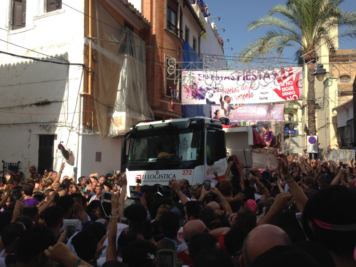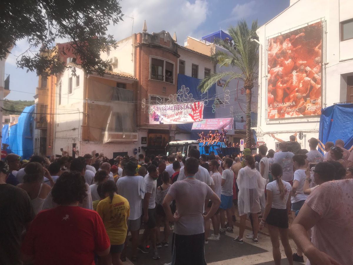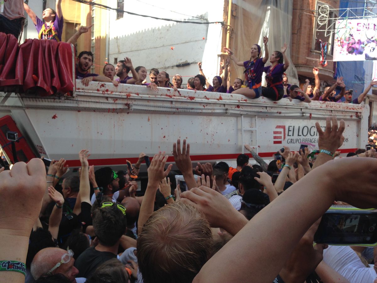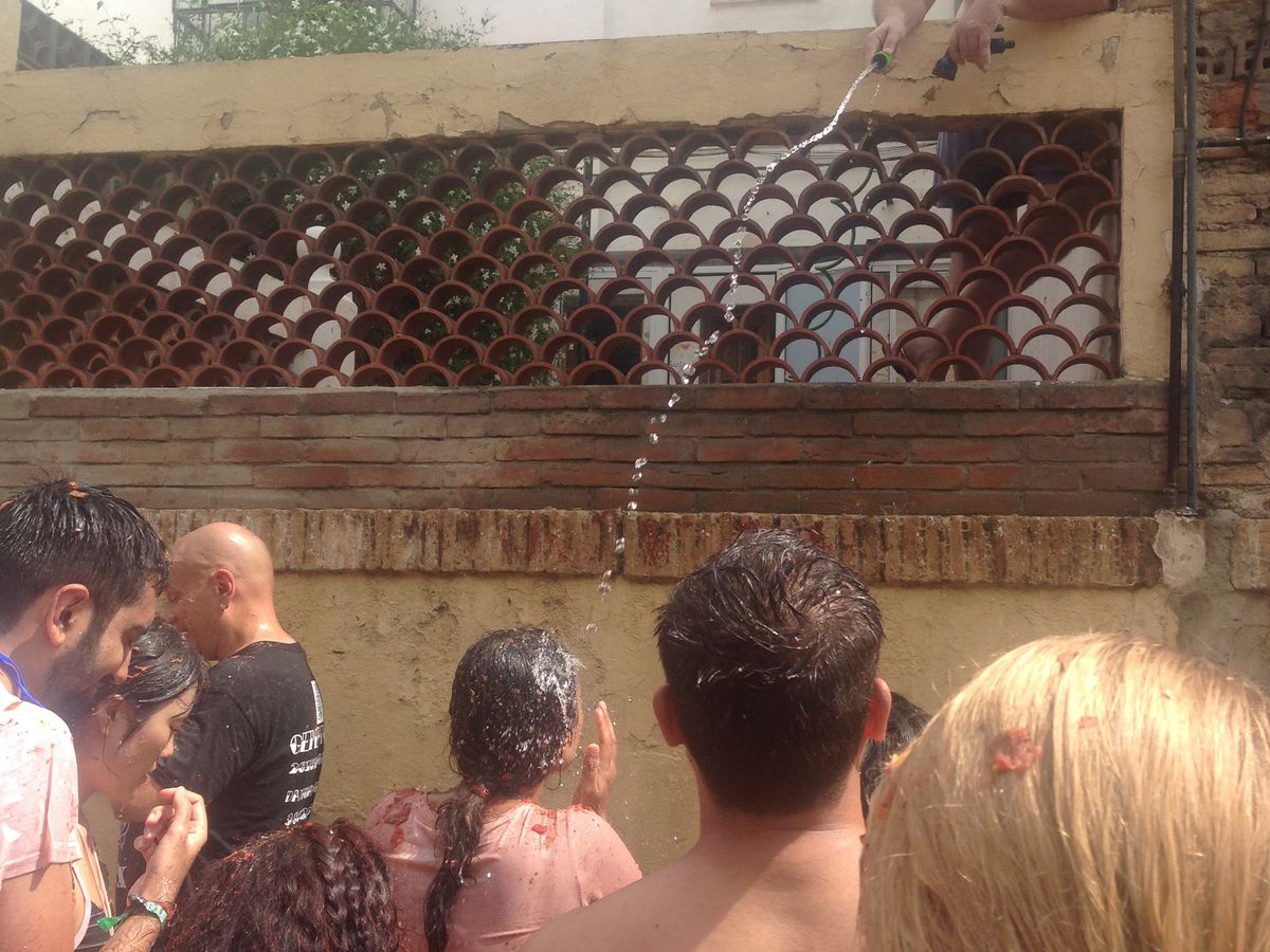 ツアー工程について説明すると、最初はバルセロナに開催日早朝に集合しました。そこから約6時間(休憩も含む)でブニョールへ到着します。そして、各自が貴重品だけ持ち祭り会場へ移動します。私たちは少量のお金とゴーグル、防水ケースに入れたスマホ、そして防水カメラを持って行きました。そして、トマト祭りの前座としてハムを木にくくりつけた、パロ・ハボン(石鹸棒)が行われていました。ここから会場のボルテージは上がって行きました!トマト祭り開催時刻になるとトマトを積んだトラックがやってきてスタートです。中心部に近づくほどトマトの投げ合いが激しくなります!私たちはその中へ飛び込んで行きました。人混みでトマトの飛んでくる方向がわかりませんでしたが、ゴーグルをつけていたことで、目は守れました(笑)しばらくしてから人混みから離れスマホで撮影した写真を投稿しました!防水ケースも必須です。もし忘れた場合でも会場の近くで販売していました。トマト祭り終了後の人が少なくなった時間はトマトにダイブすることもできました(笑)ツアーに同行していただいた日本人スタッフの方も終始優しく迅速に対応してくださり、安心感もありました。今回の祭りは、日本では経験できない貴重な経験になりました。是非、次回参加の機会があればこのツアーで参加したいと思います。