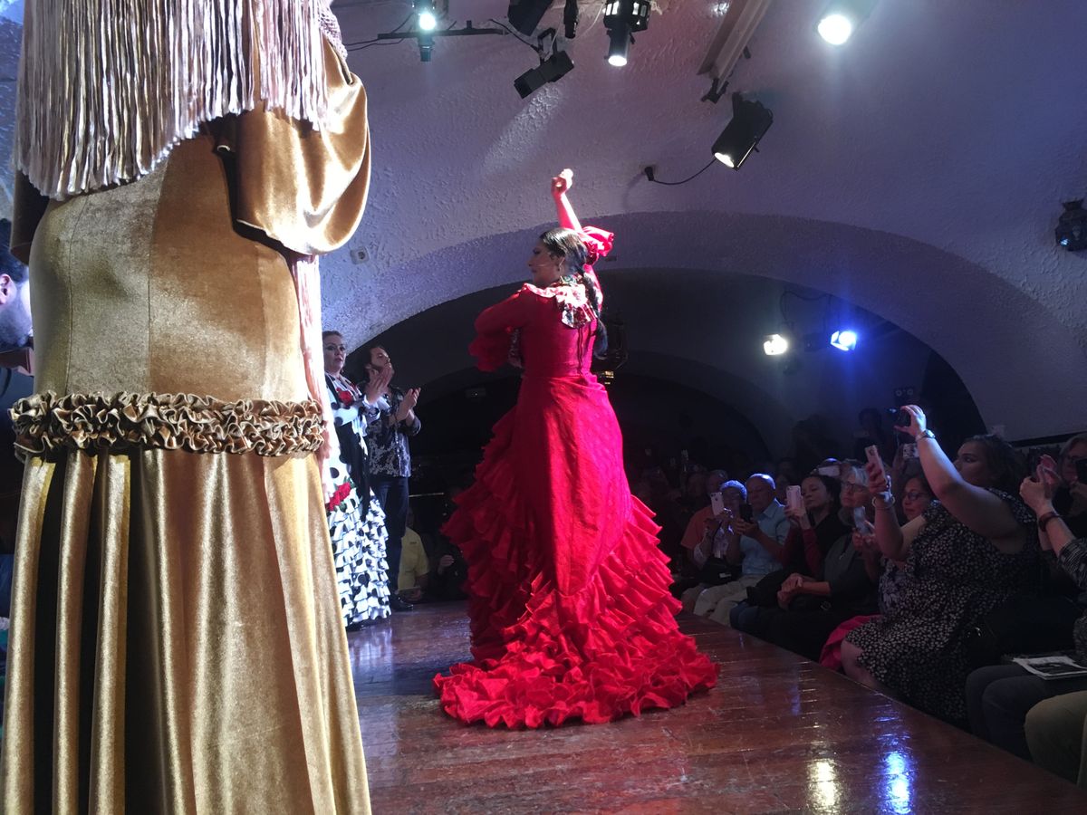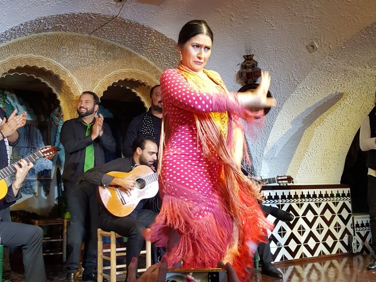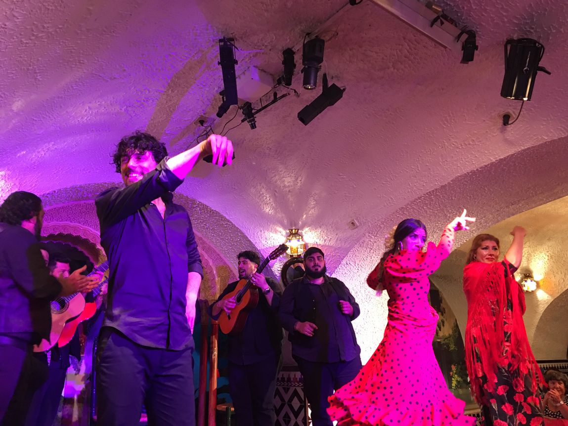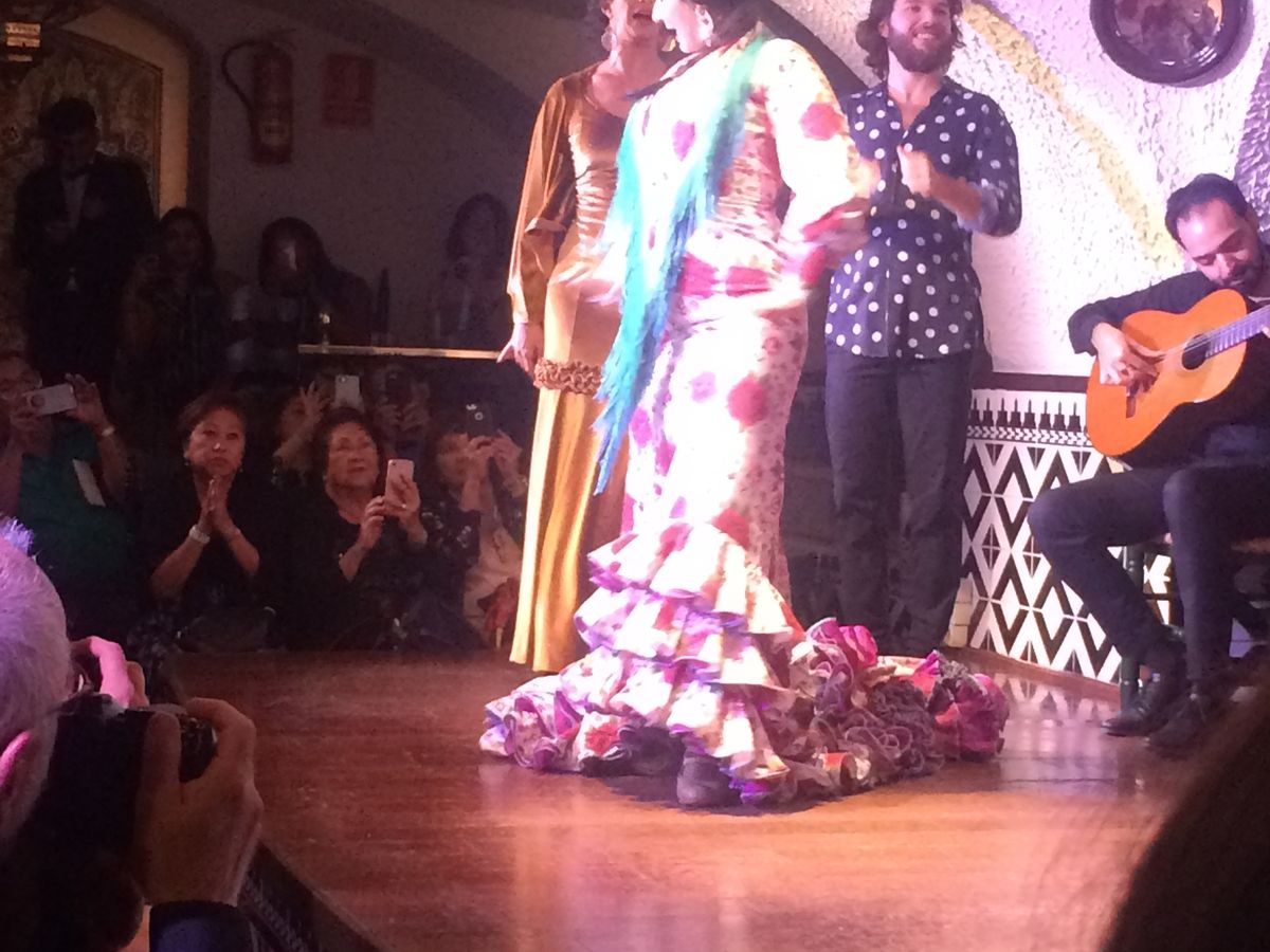 ディナー&飲み放題付きに行きました。グラナダの洞窟フラメンコと、どちらにするか迷いました。洞窟は前に行ったことがあって、間近で見れて良かったのですが、やはり初めてのほうにしました。でもこちらにして正解でした。食事のメニューも多く、味もとても美味しかったです。ゆっくり食事をしてから場所を、隣りのステージに移動してフラメンコの観賞です。かぶりつきの席で凄く興奮して見ていました。ショーの間は撮影禁止でしたが、最後に写真タイムを取ってくれて最高の写真が撮れました。