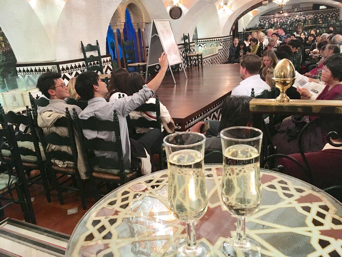 19時頃になるとフラメンコショーが行われる別室に案内され、お待ちかねのカヴァも頂けます!狭くアットホームな空間なのでライブ感たっぷりで鑑賞できます。座席は基本的に指示されますが希望も伝えることができる感じでした。