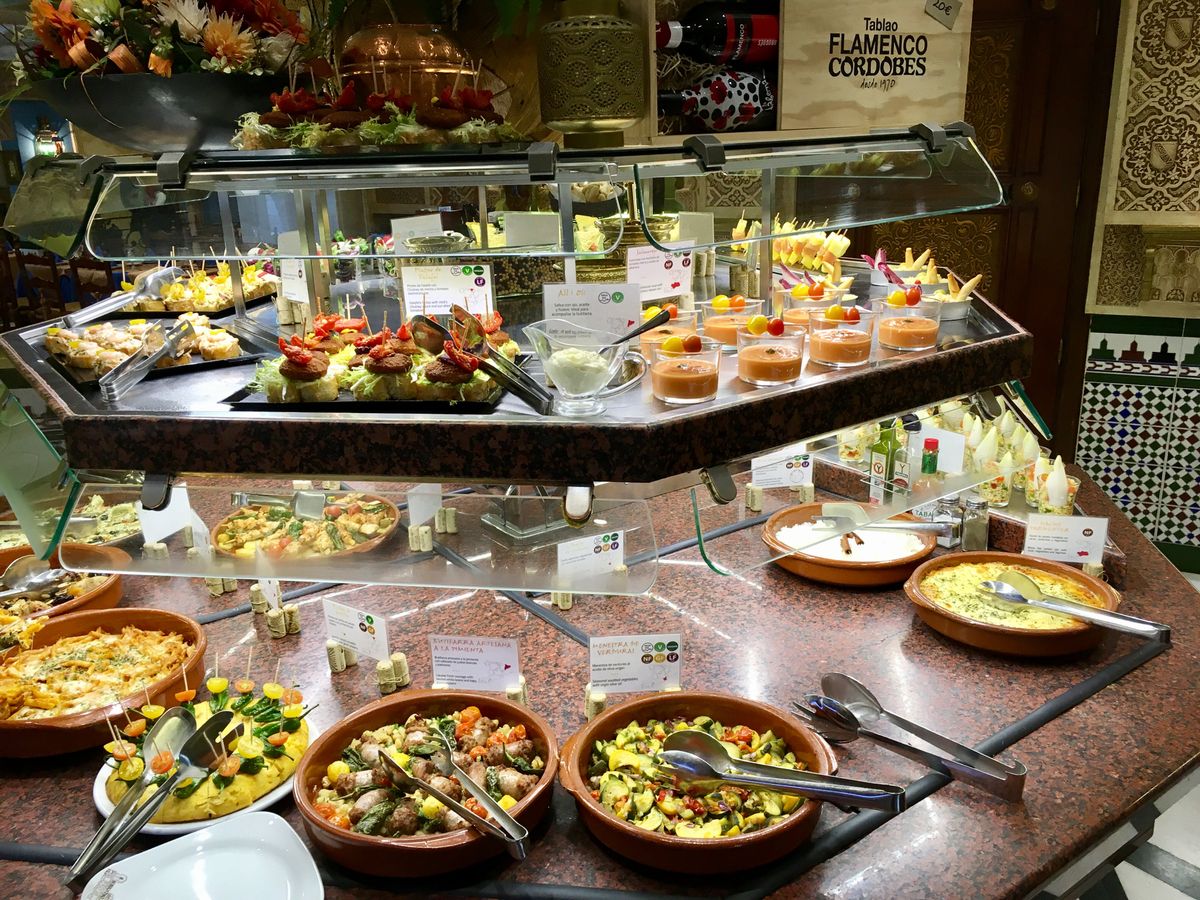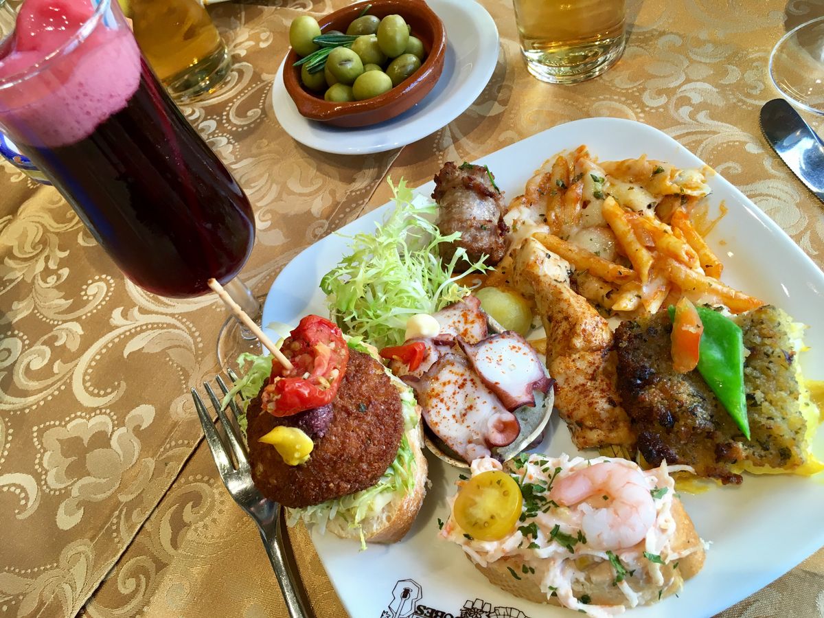 料理はピンチョス、タパス、パエリア、デザートなどビュッフェスタイルで食べ放題でした。品数も多く食べ切れないほどの量ですよ。