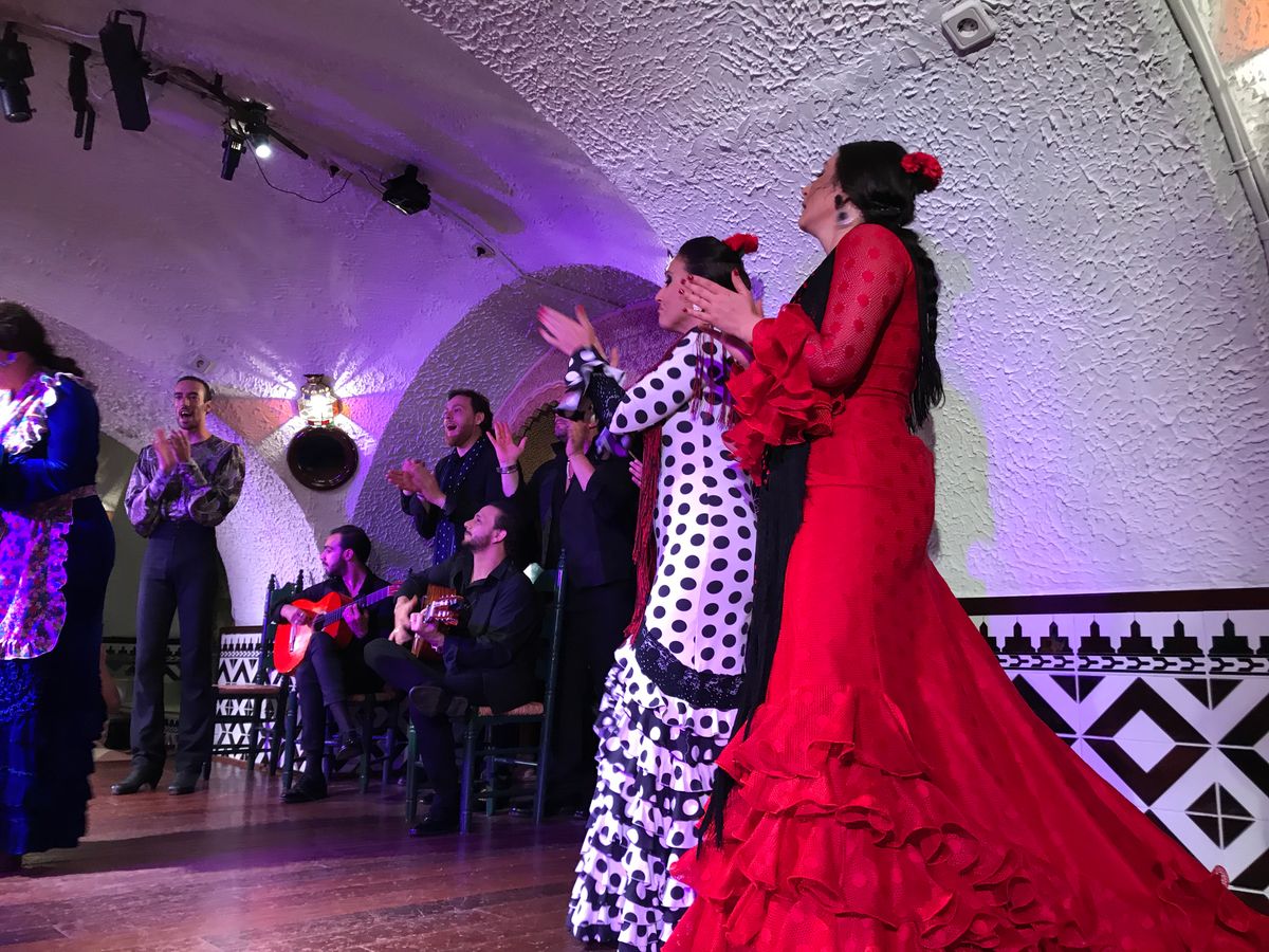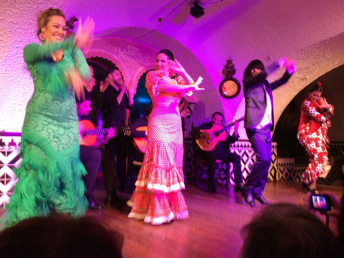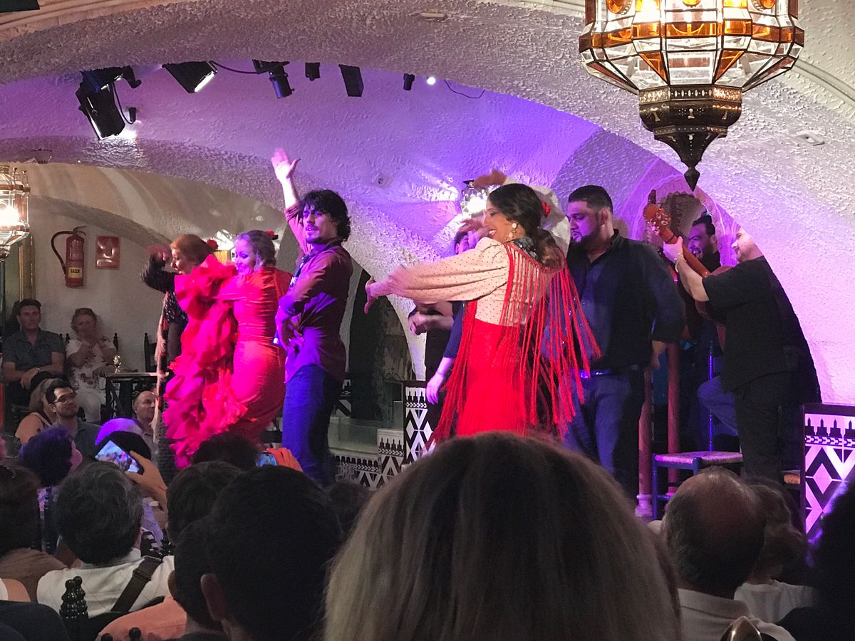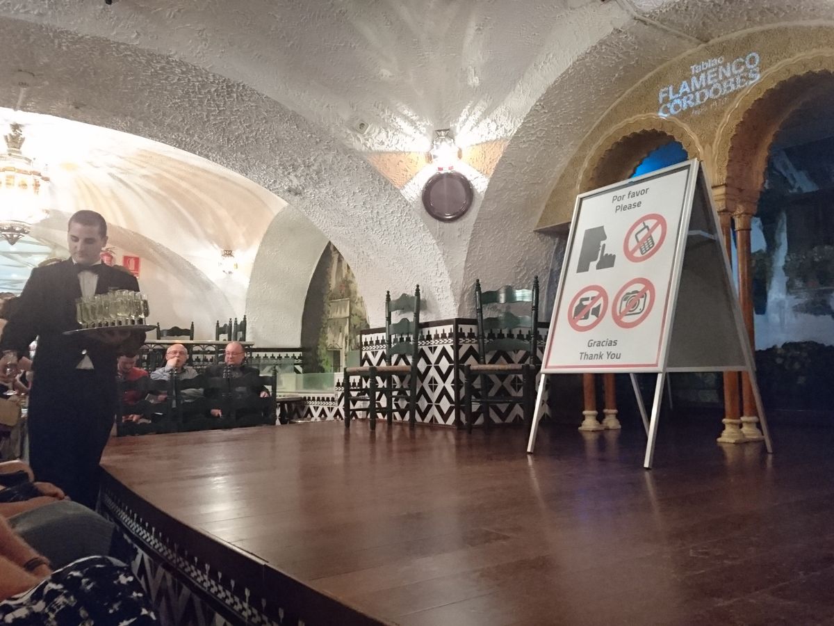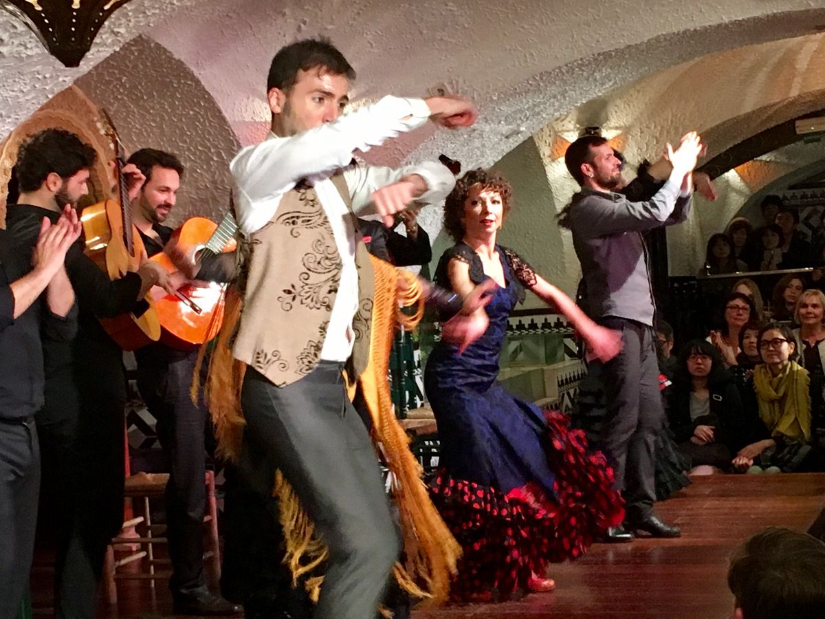 食後のフラメンコも小さなハコで迫力のステージでした。アドヴァイス通り早めに会場に着いたおかげで最前列に着席もできてよく見えました。なんとなく、「フラメンコはこいういもので、地域によってこういう特徴があって、今日はこういうスタイルをお見せしまーす。」みたいな解説があるのかと思いきや、いきなりステージが始まって驚きました。演者さんたちがアイコンタクトで即興的にステージを作り上げているライブ感がしました。時間も長すぎず短すぎず、会場のトイレも綺麗で良かったです。(観光客が多いので、トイレで「あなたどこから来たの?私は〜」みたいな話でちょっと盛り上がりました。)