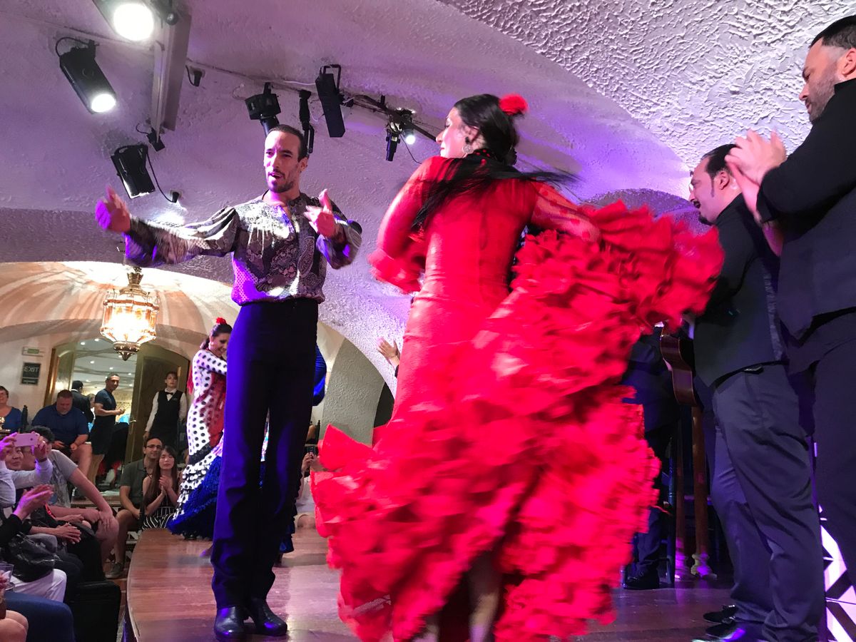 場所を少し迷いましたが、時間には着いて早速ビュフェスタイルのディナーにビール、ワインもサービスでした。日本人は私と他2組でしたがステージの最前列で迫力満点のフラメンコを満喫しました。イケメンのダンサーの汗が飛び散り、情熱的な女性のダンサーのダイナミックな力強さとプロ意識を感じました。評判を見てここに参加しましたが大正解でした。最後に写真タイムがあり、それぞれのダンスの写真が撮れます。地下鉄もすぐ近くにあり、通りに面しているのでとても安全な場所でお薦めです。