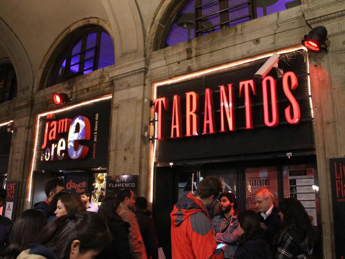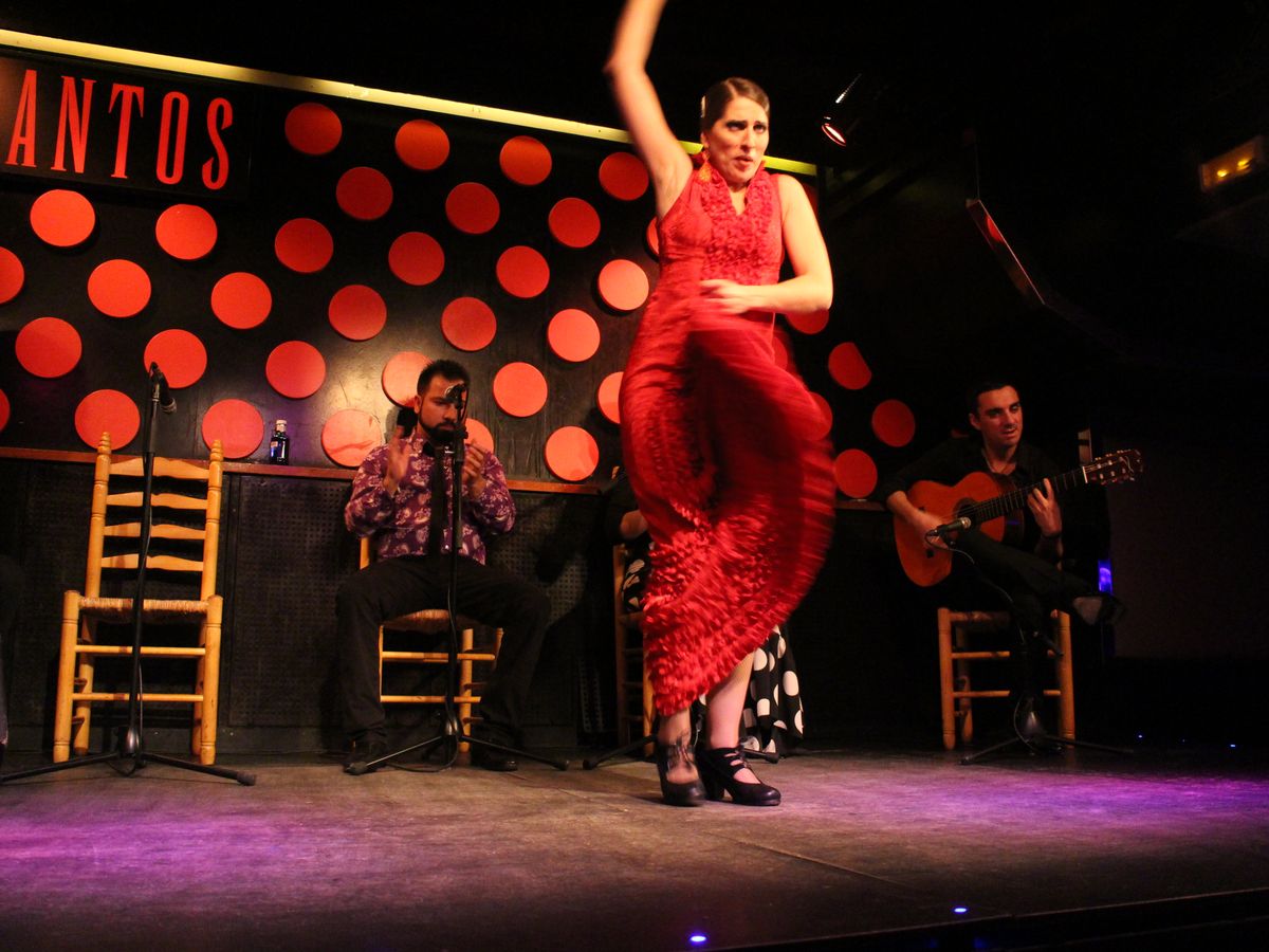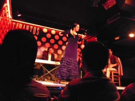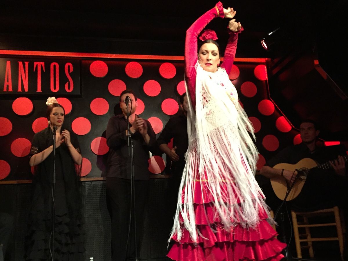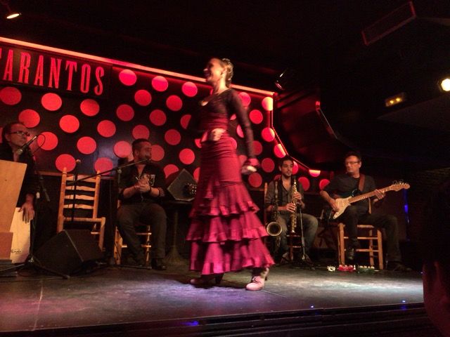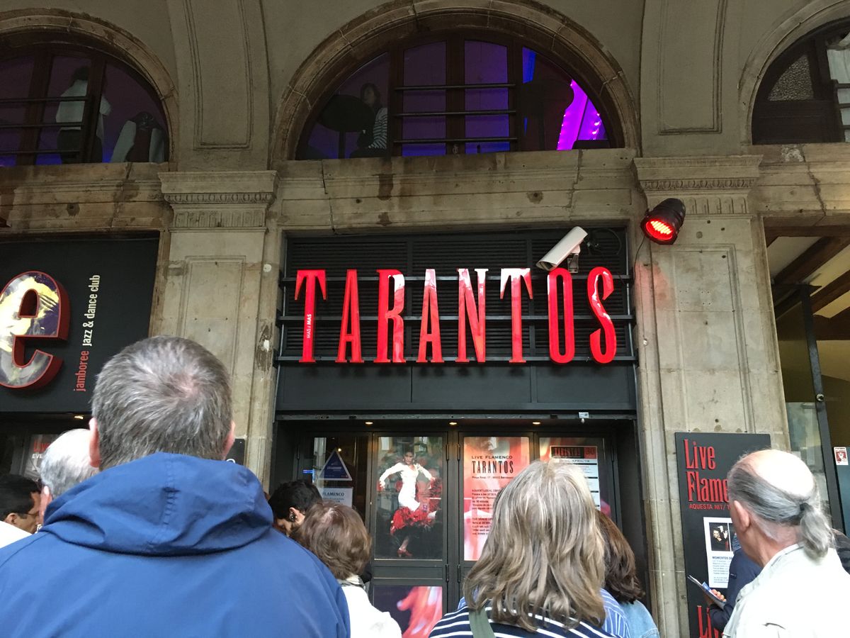 有名タブラオのロス・タラントスは座席指定は出来ず、開場の20時に会場へ。当日は団体客が来ており座席は2列目と5列目にそれぞれのペアで座りました。開始前にガイドさんがフラメンコの踊りに込められた男女の思いや歌の思いを教えて下さり、"スペインの民族舞踊"と思っていた私にとっては目からうろこで、踊りを見る目が変わりました。踊りは大迫力で、止まった瞬間の踊り手の息遣いも聞こえ、大満足でした。30分間であっという間でしたが、ほろ酔いの私たちにはちょうどよい程度。終始みとれていました。