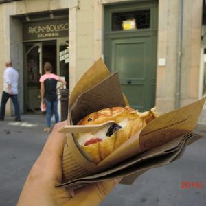 ジローナはほかの体験談にもあったように、ぶらぶらしてから、ランチをとるには自由行動の時間が短めでした。ガイドさんおすすめのアイスクリーム屋さんでパンケーキに挟まれたアイスを食べ、そのあとに独立広場にいくつかレストランやカフェがあるのですが、そのなかの一つのお店でピンチョスをつまみました。これがとても美味しかったです。
