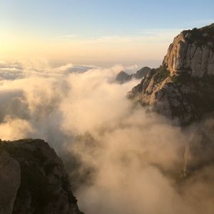 集合場所のカタルーニャ広場はまだ夜の装い。モンセラットに向かう山道では眼下に広がる一面の雲海。