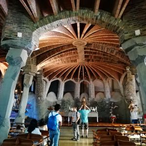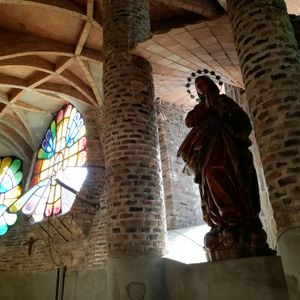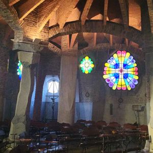 郊外にあるコロニアグエル教会の内観はまるで動物の骨格標本を中から観ているような錯覚に陥るほど美しい曲線美で、大小大きさの違う柱やガウディらしい曲線美の階段、ガウディ作のイスに座ることができたのも貴重な体験でした。外観のステンドグラスの美しさももちろん◎。また、やはりサクラダファミリアほど有名でないため、私たちのグループがいる時間は私たちだけの見学でした。