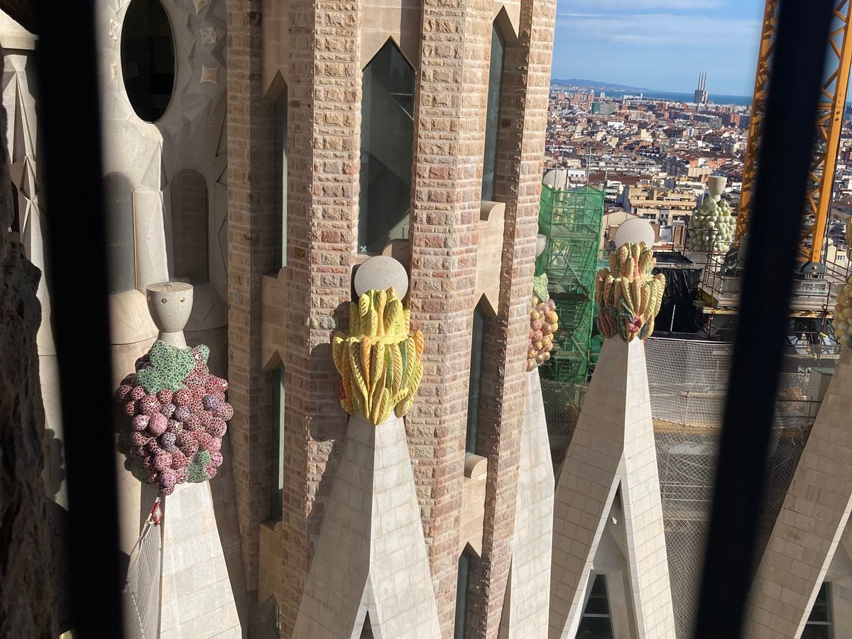 サンパウ病院から徒歩でサグラダファミリアまで歩きますが、なんとなく歩いても得られない情報と感動がありました。サグラダファミリアの内部は巨大かつとても美しく、それだけでも価値は充分ですが、鐘楼に登った後に狭い螺旋階段を果てしなく降りるのはスリリングなアクティビティでした。眺望は建設中の隣の塔を近くで見る感じです。