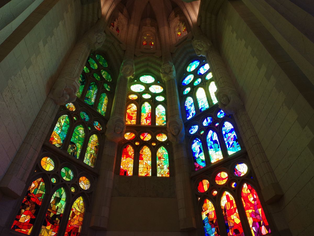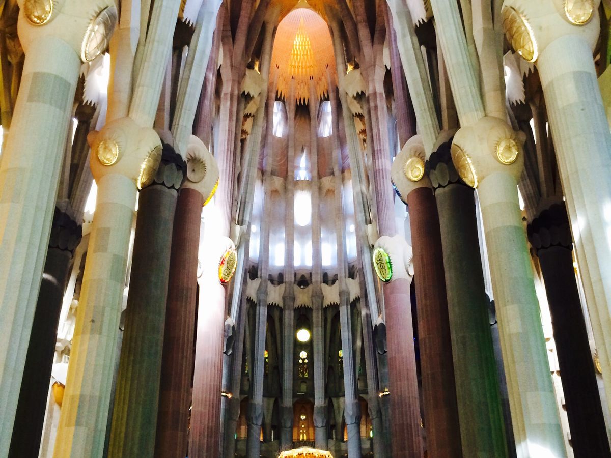 集合場所の凱旋門から約30人の日本人でバスに乗り出発しました。サグラダファミリアではガイドさんがひととおり説明してくれたらツアーはそこで解散。各自でエレベータに乗ります。私達は時間に余裕があるため、エレベータを降りたあとももう一度、じっくり見学をし、ガウディのすばらしさを堪能しました。サグラダファミリアは外観と内部でまったく別の趣があります。