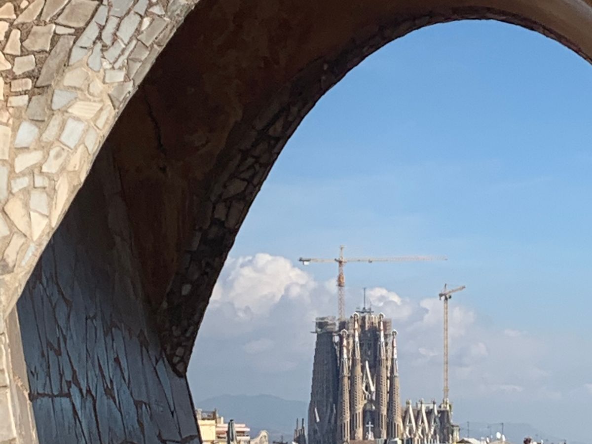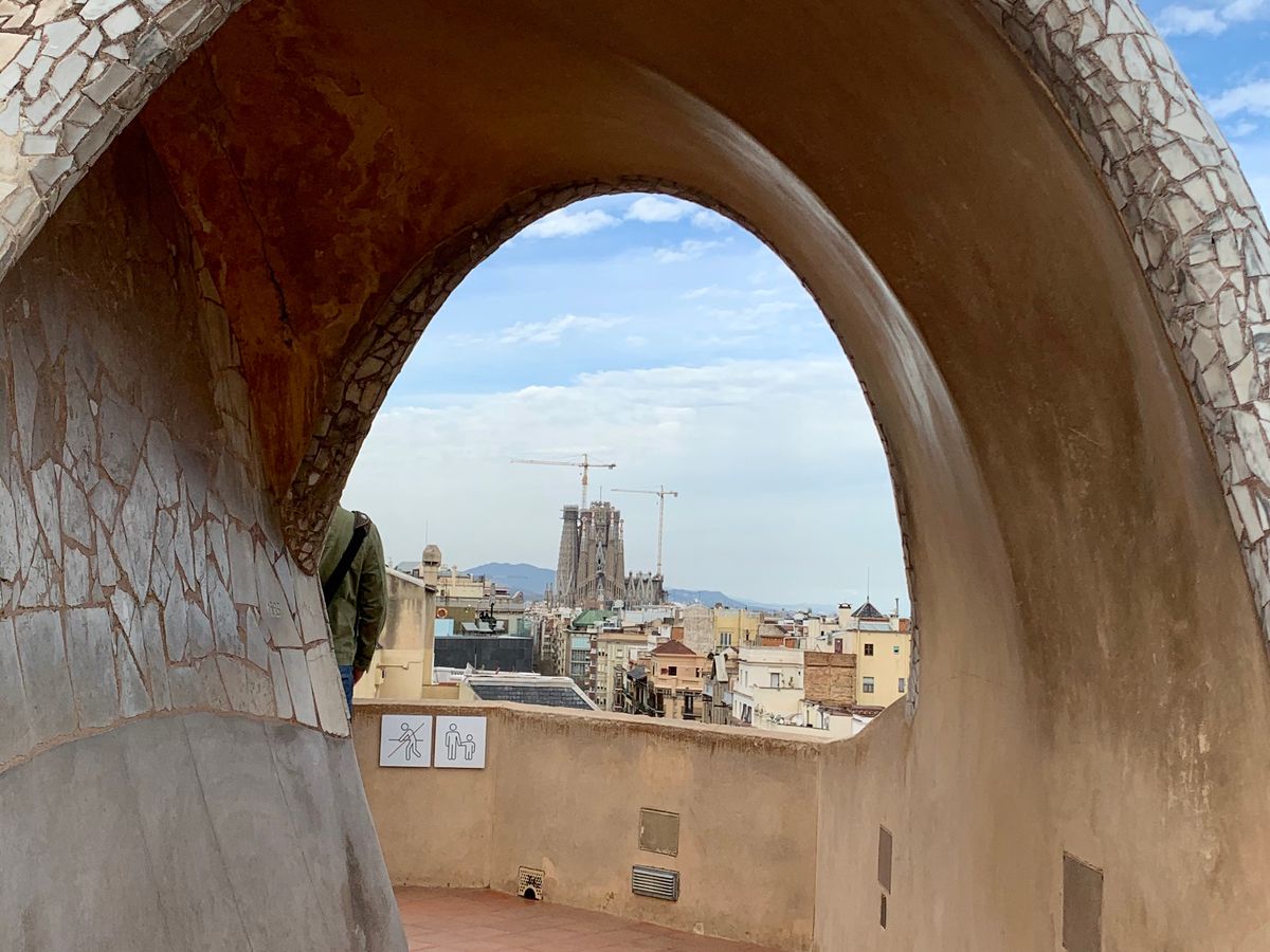 屋上のアーチから遠くに見えるサグラダ・ファミリア!