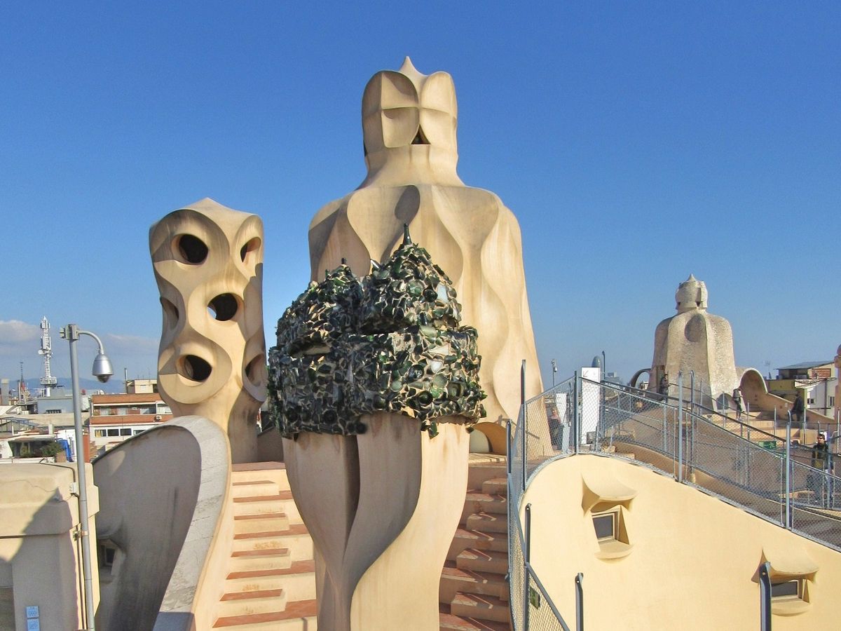 カサ・ミラは居住可能な世界遺産。1Fはレストラン。見学は、先ずエレベーターで屋上へ。ガウディ独特のオブジェが広がるルーフです。内部は、各部屋のインテリアや展示スペースにある建物のミニチュアを見てまわりました。