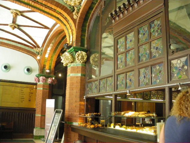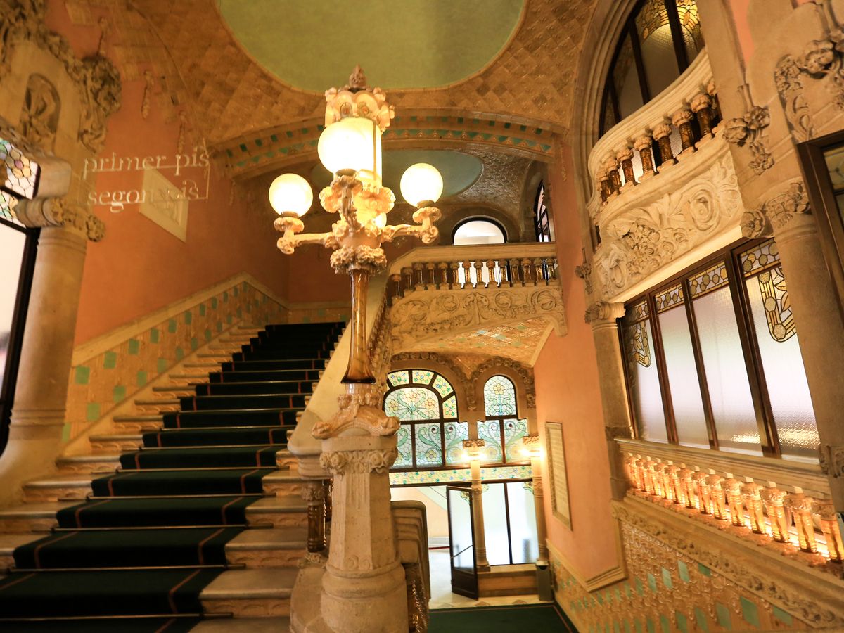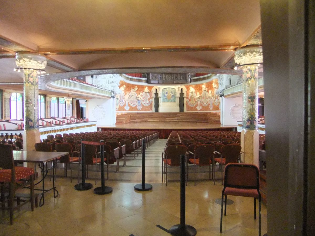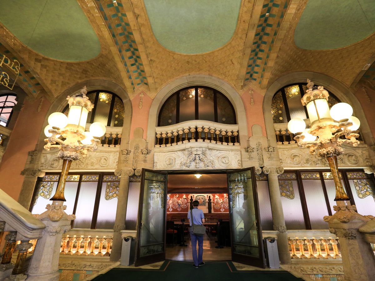 Carrer de Pau Claris通りから少し奥まったところに入口がありますが、美しく装飾された正面の入口は反対側にあります。それは、他のヨーロッパのコンサート会場とは全く異なり、色彩豊かで斬新なものでした。また、音楽堂内には誰でも入れるカフェやショップがあり沢山の方が利用していました。