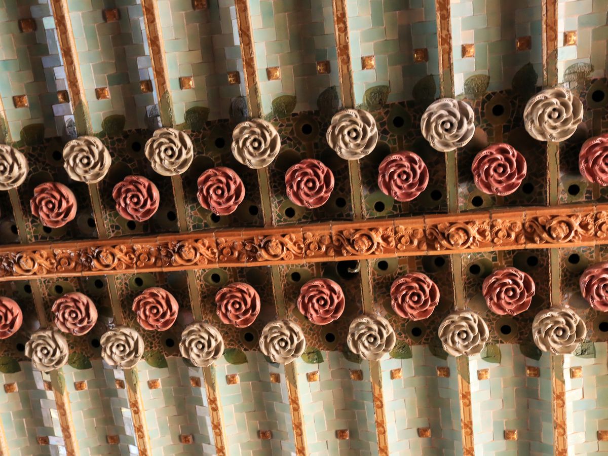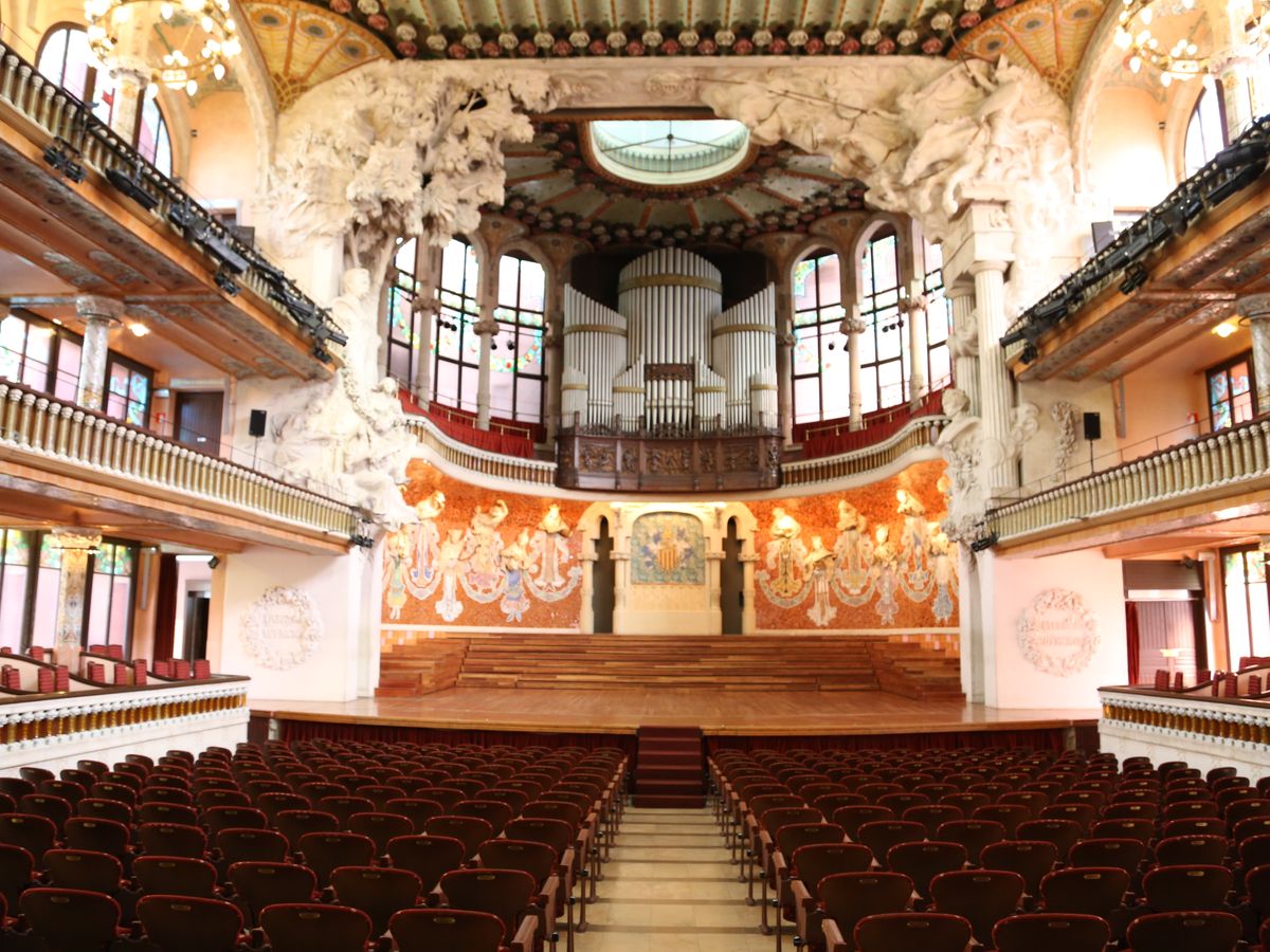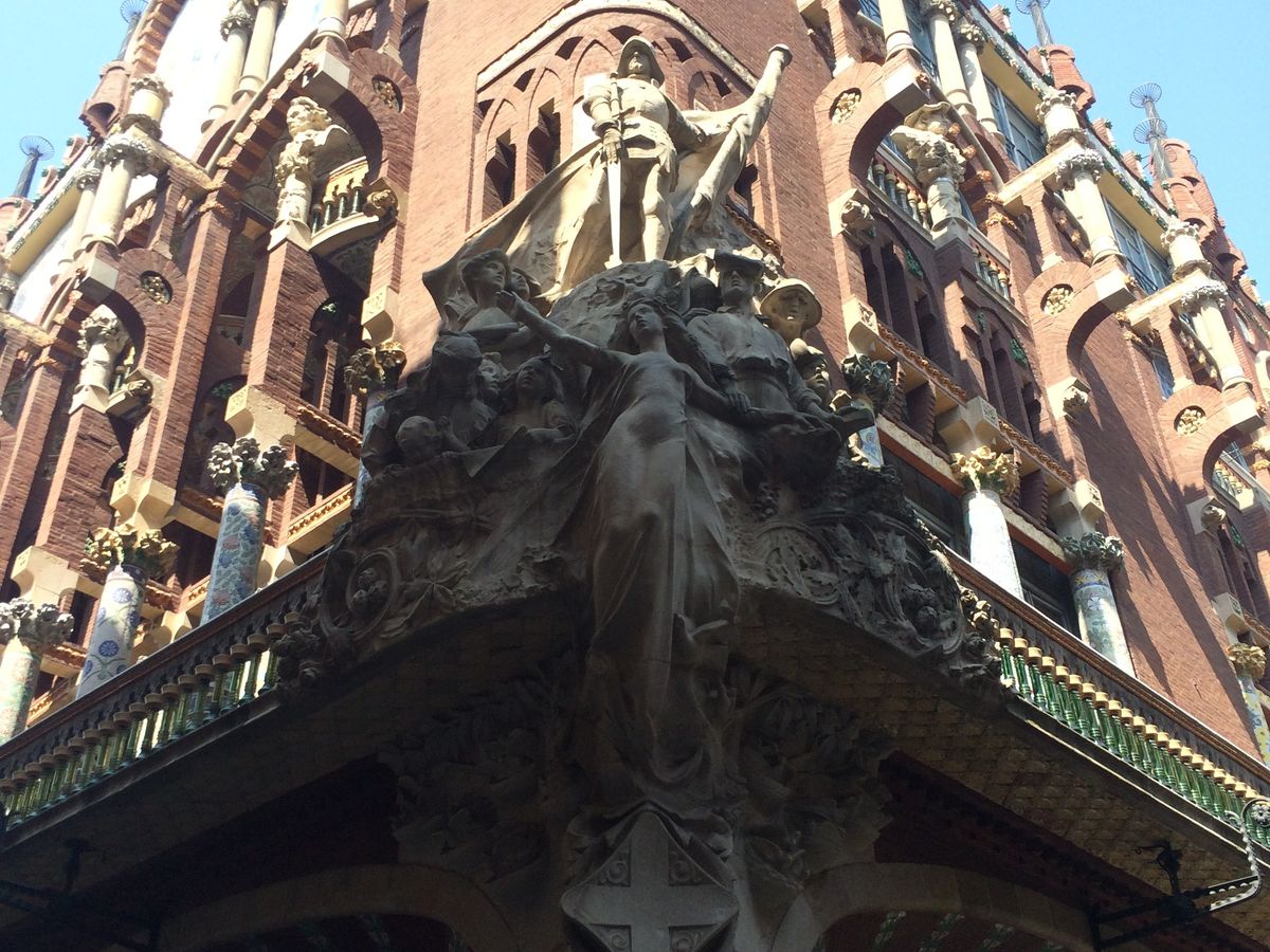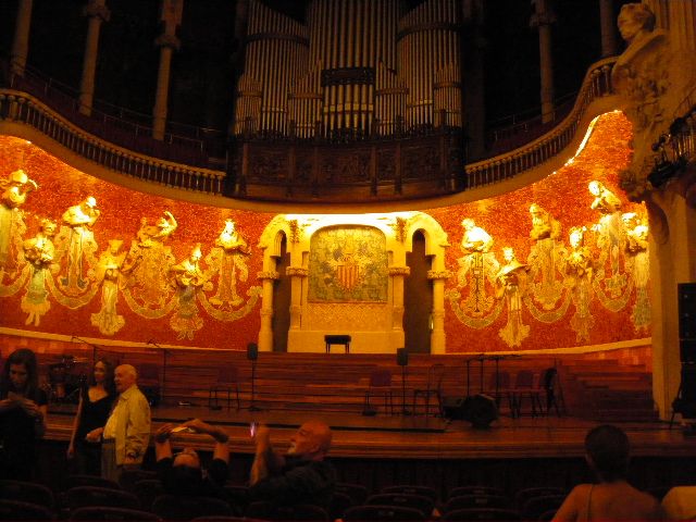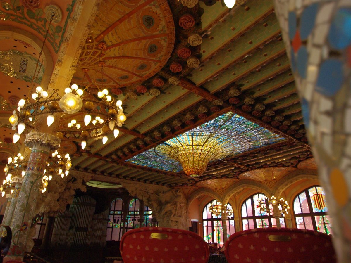Carrer de Pau Claris通りから少し奥まったところに入口がありますが、美しく装飾された正面の入口は反対側にあります。それは、他のヨーロッパのコンサート会場とは全く異なり、色彩豊かで斬新なものでした。また、音楽堂内には誰でも入れるカフェやショップがあり沢山の方が利用していました。