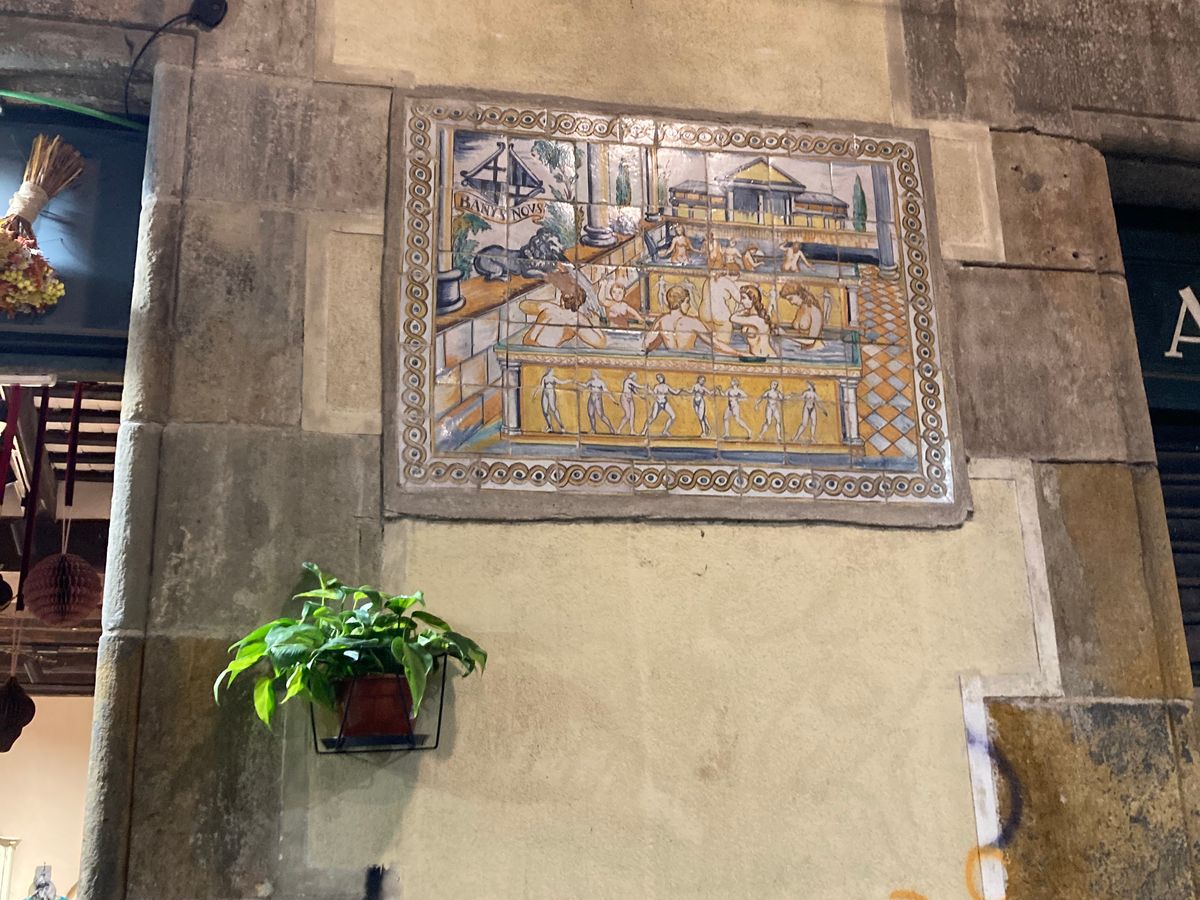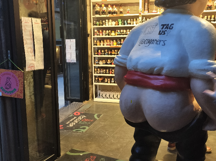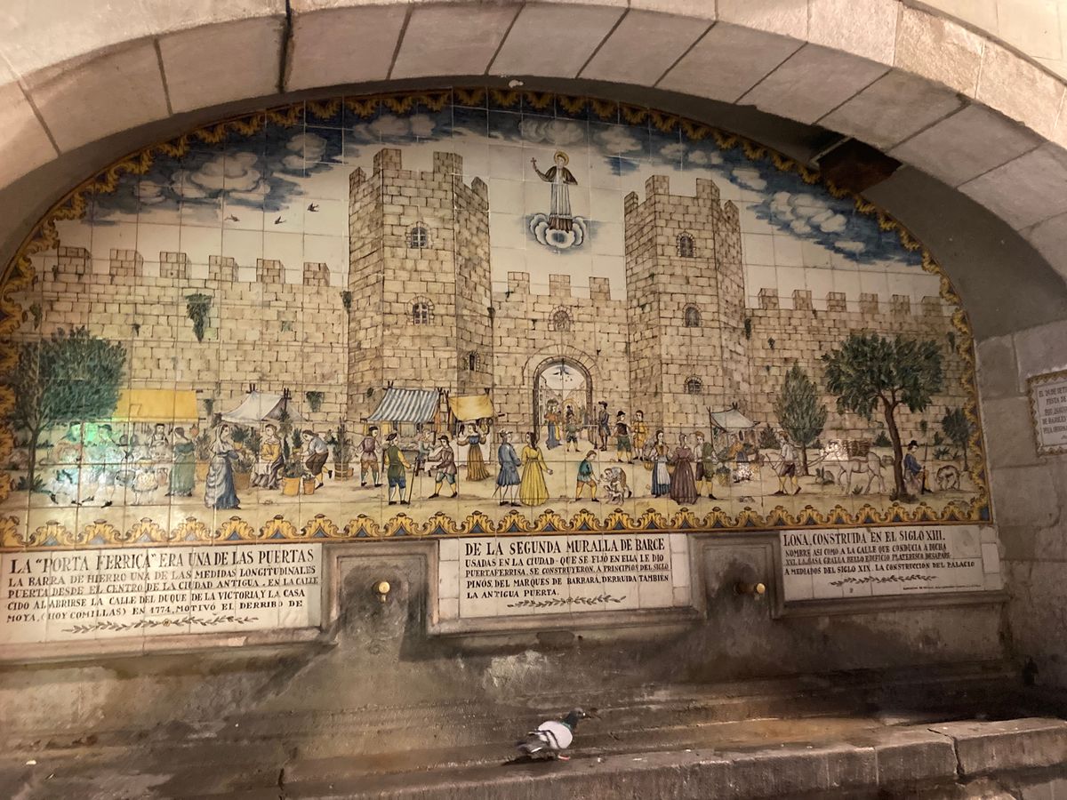 ガイドさんは日本に住んでいたことのある、陽気で雄弁なスペインの方。出身はフランス国境の近くということでした。身振り手振りを交えながらの、街歩きと彼の話に引き込まれていきます。バルセロナが小さな港町だったこと、広がっていった歴史やマドリードとのライバル関係、カガネルという豊作や繁栄を願った排便人形など、更にバルセロナに興味が湧いてくる話が聞けました。通りや建物、壁画などを使って説明してくれました。何度かスマホで調べることはありましたが、全体的な小道具は手持ちのバインダーファイルから説明の紙を指で差しながらというスタイルなので、暗い場所でも解りやすかったです。