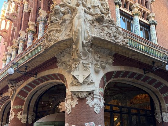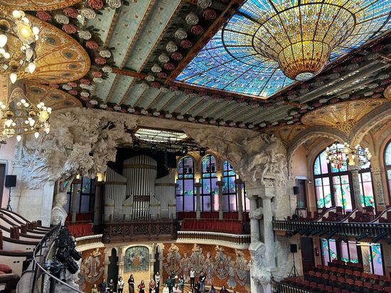 1908年、建築家リュイス・ドメネク・イ・モンタネールにより、カタルーニャ地方で活躍する有名な合唱団、オルフェオ・カタランの本拠地として建てられたコンサートホールです。モンタネールは当時の有名建築家で、若くしてバルセロナ建築学校の教授になった時には、生徒の中にアントニ・ガウディもいました。同じく、モンタネールの作品であるサン・パウ病院と共に1997年に世界遺産に登録されました。現在も現役のホールとして使われています。