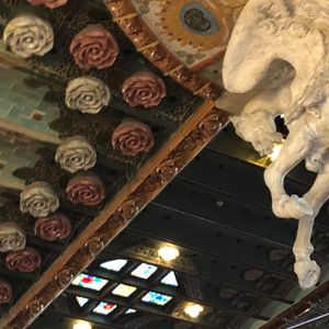 ホールの天井には、水の滴のような形をした大きなステンドグラスと華麗な彫刻が幻想的です。