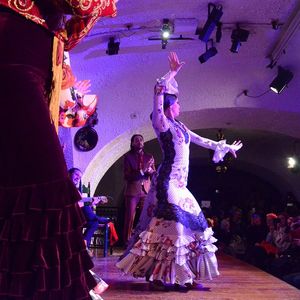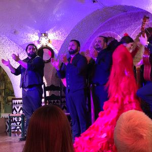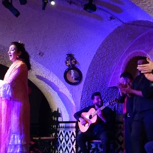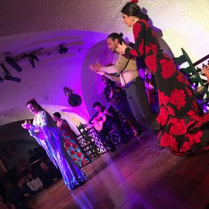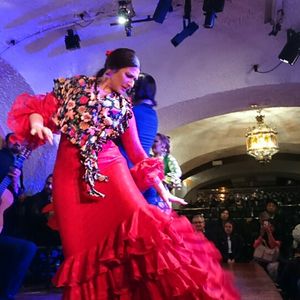 フラメンコのお兄さんは髪を結んだらイケメンでした!あと、前に座っていたおばあちゃんたちが陽気で声が大きくて元気そうで楽しかったです。フラメンコは踊りだけかと思っていたけれど歌もあって凄かったです。サングリアを飲みながら楽しめました!最後の踊りで着ていた衣装が豪華でした!また、タップを踏んでいるときの表情まで分かってすごく臨場感があり感動しました。ドリンクだけだったので席は期待していませんでしたが、前から2列目だったので大満足でした。