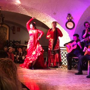 旅行初日13時位の到着でしたので18時からのコースを予約しました。フラメンコ教室があるとの事で30分早めに行きましたが、15分たっても始まらず少しがっかりでした。1番前はタパス付のコースの方で、食事付か2番目に前列にしていただいたのだと思います。料理の内容はパエリア、パン、サラダ、スープ、デザート、アルコールだったと思います。パエリアは食べたいと思っていましたが、割と高くつくと聞いていたので、ここで食べられて良かったと思います。フラメンコは色んな種類があり、男性がしゃがれた声で歌ったり、女性が3人で踊ったり、間近で見たいと思ってたので、とても良かったです。