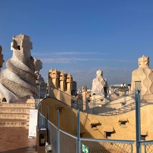 DIAIONAL駅の近く。グラシア通り沿いに歩くと、考えていたよりかなり大きくてビックリ。事前予約してあったが、上手く伝わらなくて少し待たされたが無事入場。日本語オーディオガイドで自分のペースでガウディの当時に思いを馳せながら屋上までゆっくりと見学。自然光の取り入れ方に注目。屋上もガウディらしい空間で、町並みも見渡せる