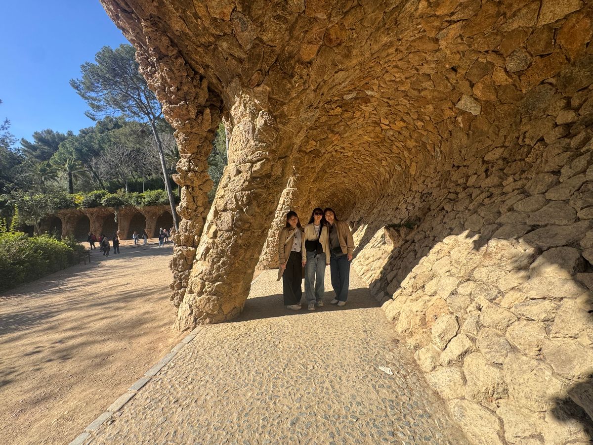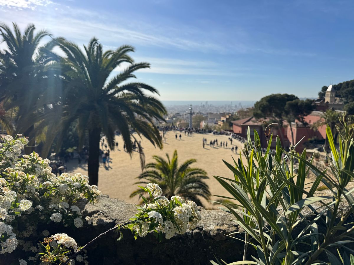 坂が多いので、ゆっくり休みながら散策。モザイクアートや柱廊をスマホに納めテラスでバルセロナ一望。2月とは思えない暖かさで、皆まったりとお休み。