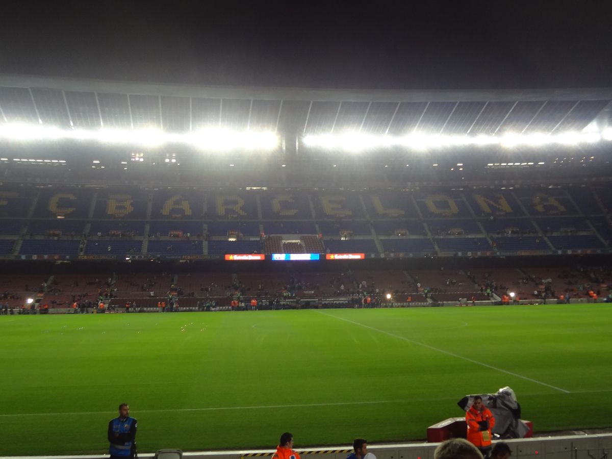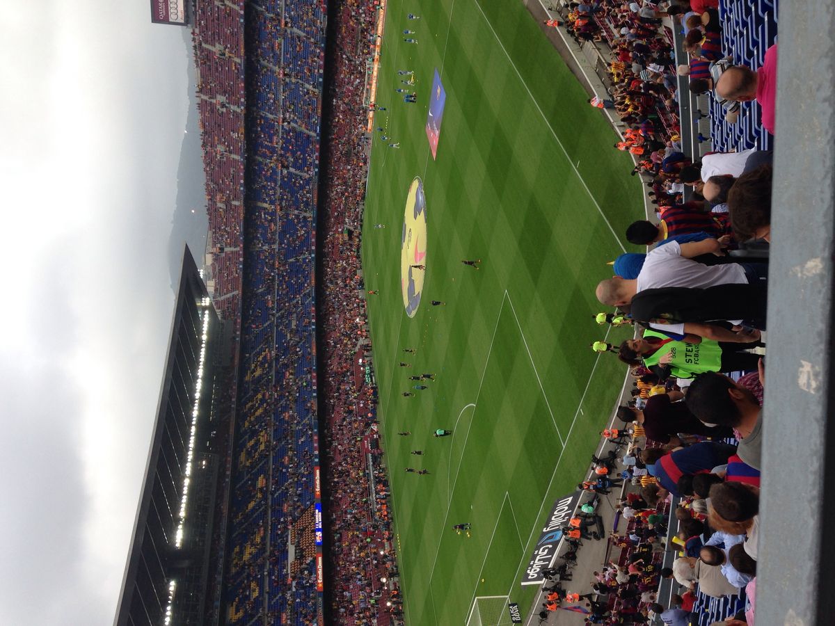 カテゴリー1プレミアムをお願いし、1階席ほぼ中央、後方の席でした。2階席が視界の1/3ほどを占めますが、ピッチは完璧に見えて、試合に集中できるとても良い席でした。サイドにいたメッシとネイマールが前半後半でうまく近くで観ることができましたよ!試合が始まるまでの間階段を降りていけばスタジアムすべてを見渡せて記念撮影も出来ます。早めに行けば、まだお客さんの座っていないスタンドに書いてあるFC BARCELONAの文字(正面と反対側でした)や、ゴール裏のナイキのマークもしっかり見えます。