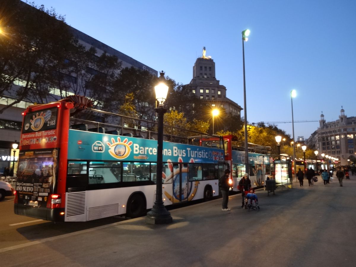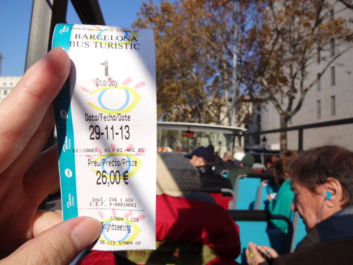 発バルセロナ、5日間の一人旅でした。初日からの2日チケットをお願いしました。1日目を旧市街を回るレッドライン、2日目は新市街を回るブルーラインを利用しました。日本語の観光ガイド付きでお得感たっぷりです。バスは広場から朝9時スタートでだいたい1周2時間位で回ります。チケット交換所は広場のバスの発着所の前にもありますが、ランブラス通りにもたくさんあります。2階席は気持ちも良いですし(10月末)、初めての方には本当におすすめです。