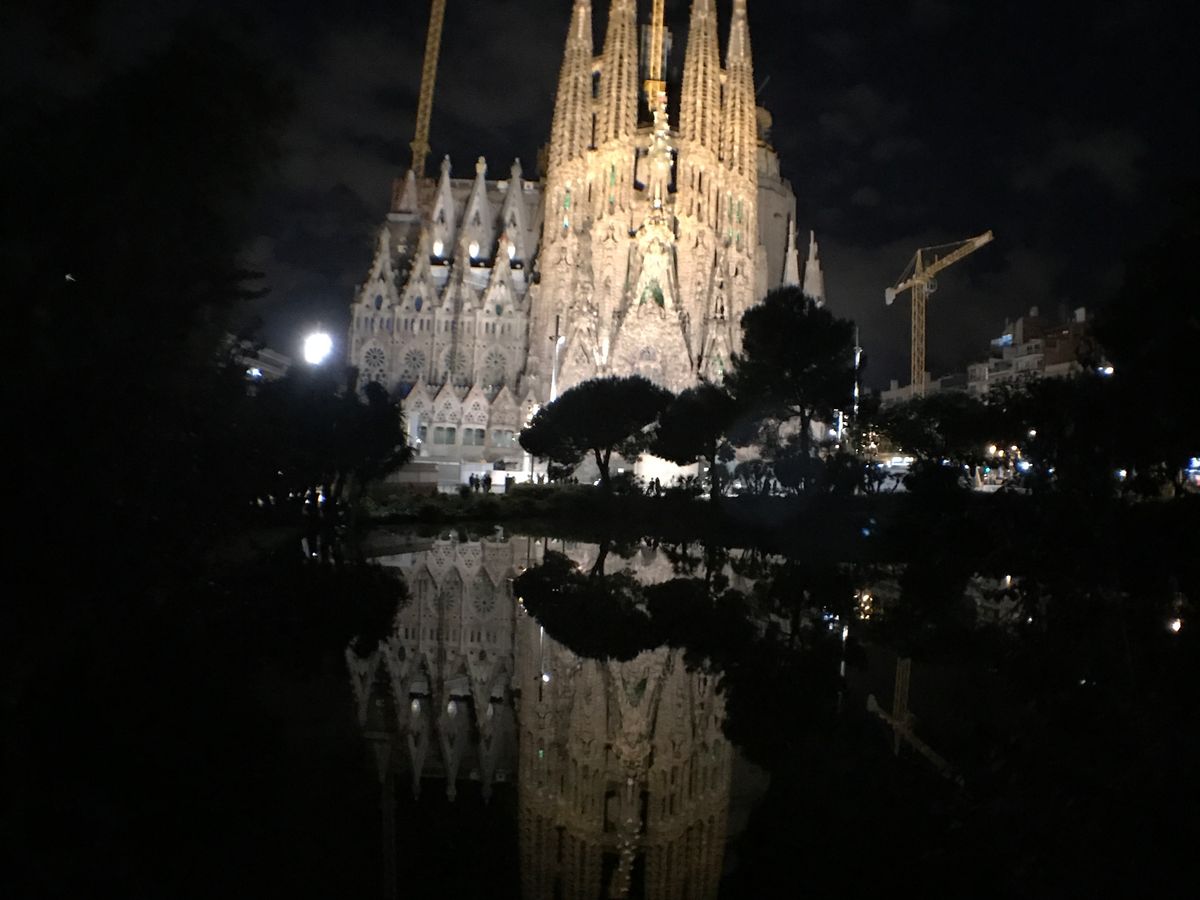 サグラダ・ファミリアの夜景、逆さサグラダ・ファミリアも綺麗に見ることができ、昼間とは全く違う印象を持つことができました。