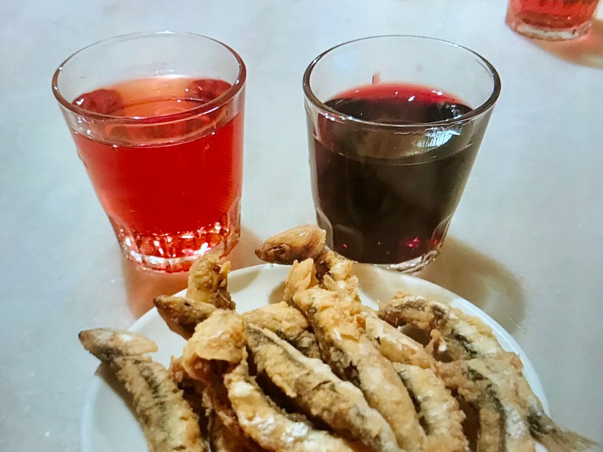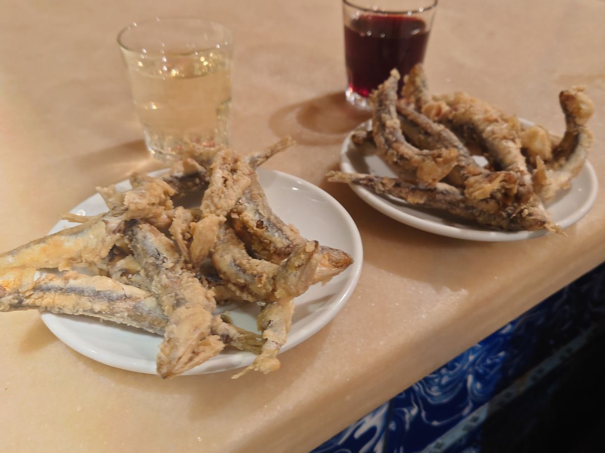 2軒目ではイワシのフライ。混んでたけども、そこはガイドさんの力で少しだけの間でしたが、座れました!あっつあつのフライとワインが良く合う!