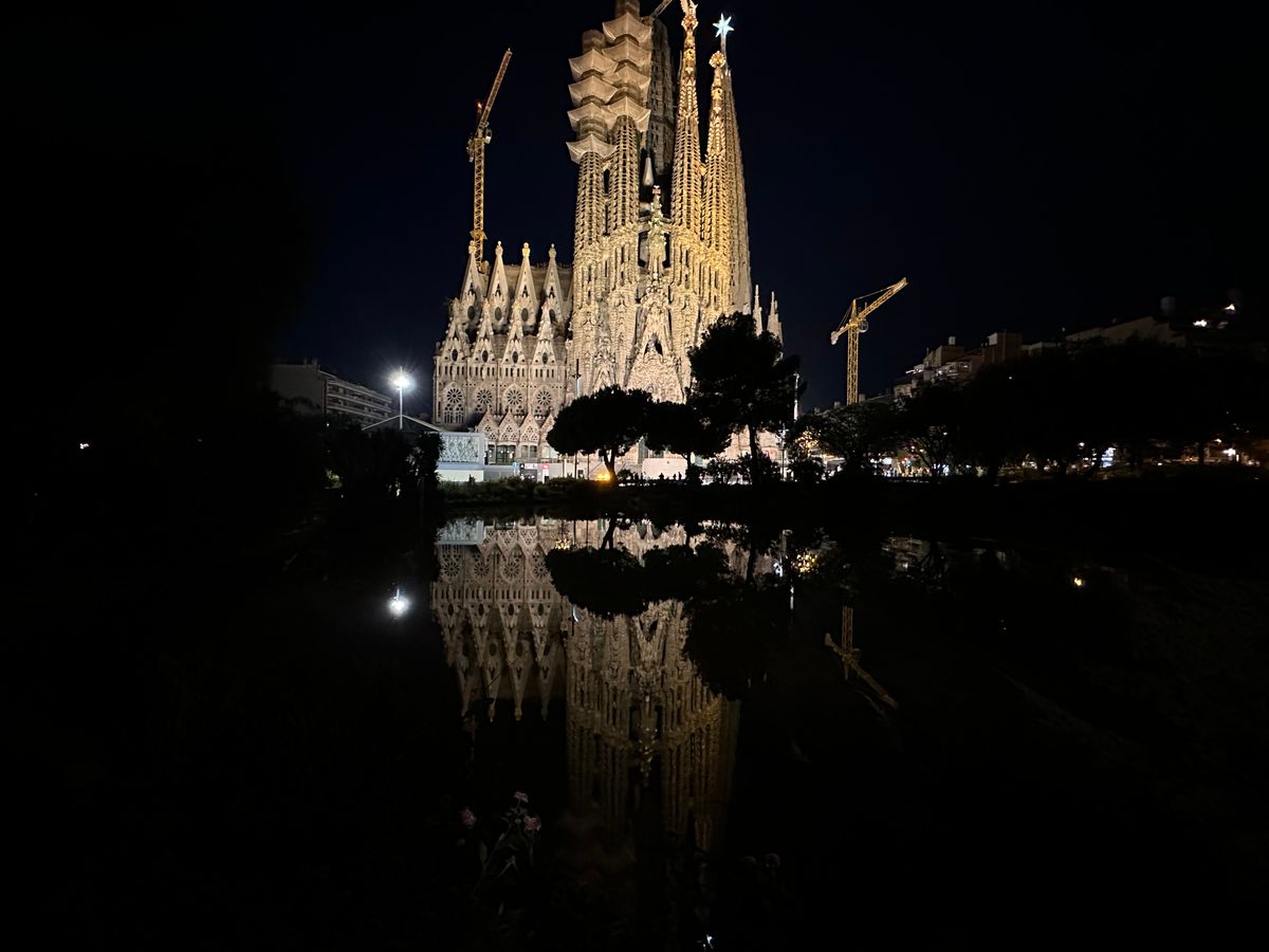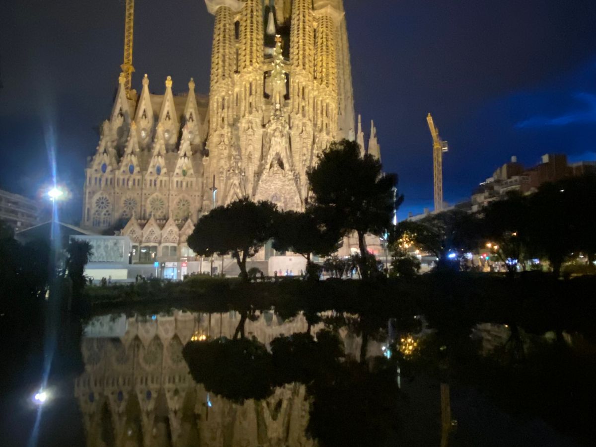 サグラダファミリアのライトアップも幻想的で素敵でした。逆さ富士ならぬ逆さサグラダファミリアも!