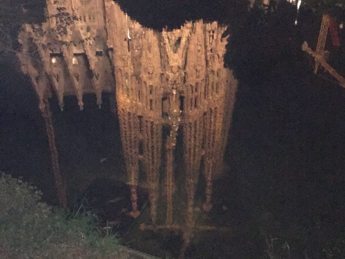 夜のサグラダ・ファミリア教会は、隣の公園の池に映るライトアップ像がくっきり見えて感動しました。