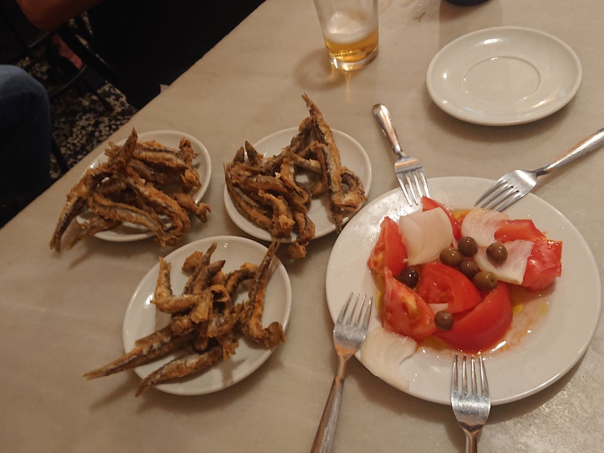 待ち合わせ後、いくつかの名所をサクサク回りながら1軒目、ピンチョスの店に入りました。お酒1杯とピンチョス3種でそれなりにお腹が膨れます。頼み方も教えてくれるので役立ちました。小道、裏道を通りながら2軒目、こちらはタパスのレストラン。1人一皿頼んでみんなでシェアしました。ガイドさんがさっとメニューを読み上げ、どれがいいか?と聞かれたので悩む時間もあまりなく、とっさに覚えていたメニューを口にしたら他の料理の同じようなものが出てきてしまい、参加者の方に申し訳なかったです。そしてここでほぼお腹いっぱいです。