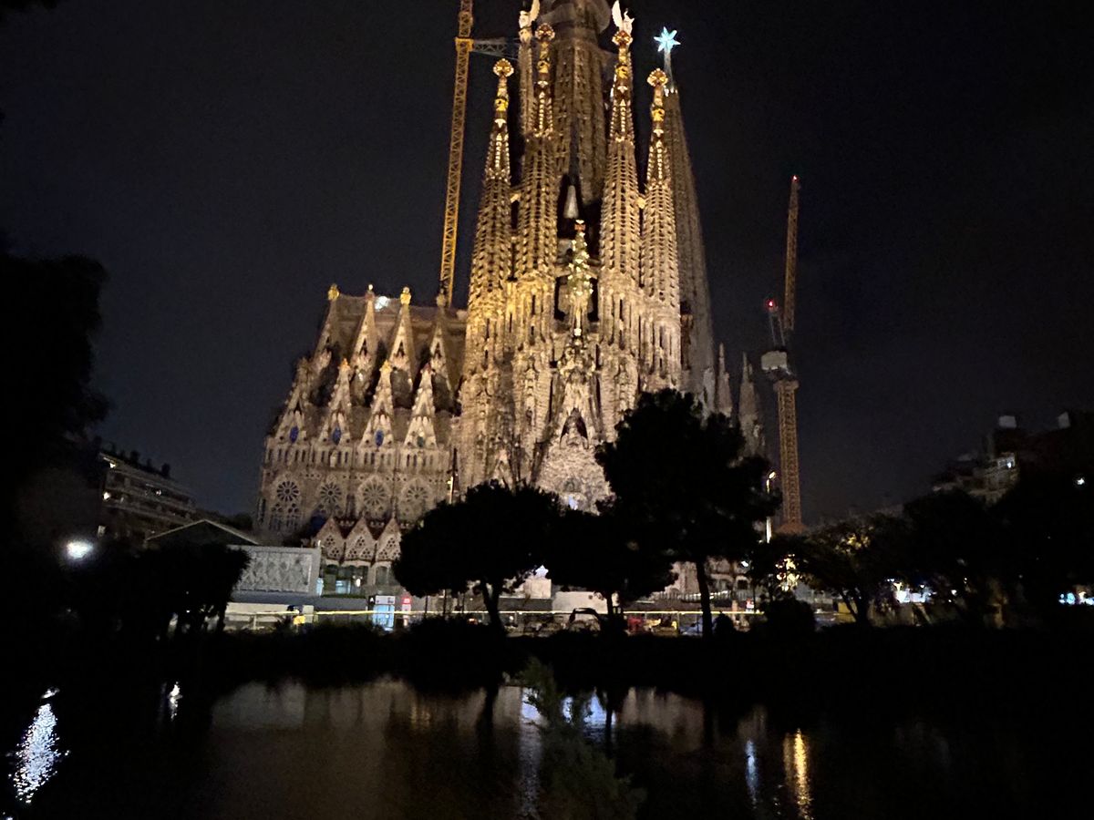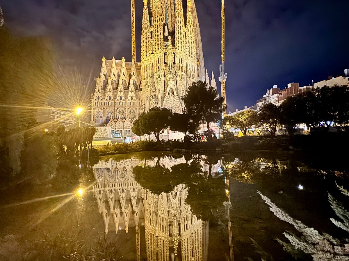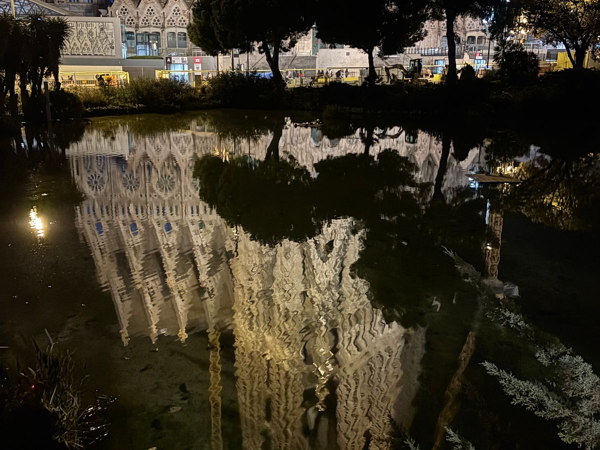 サグラダファミリアの夜景も美しかったです。雨上がりで、池に映った逆さサグラダがきれいでした。