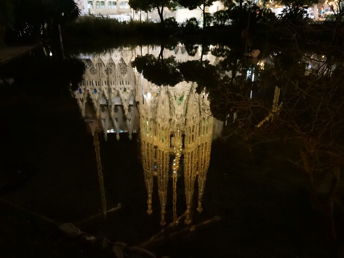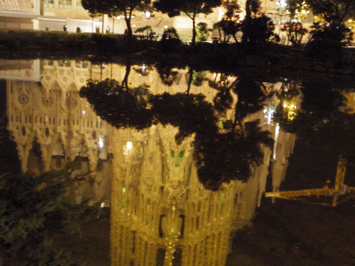 サグラダ・ファミリアは美しくライトアップされていて、ガウディ広場の池に映った姿はとても幻想的でした。
