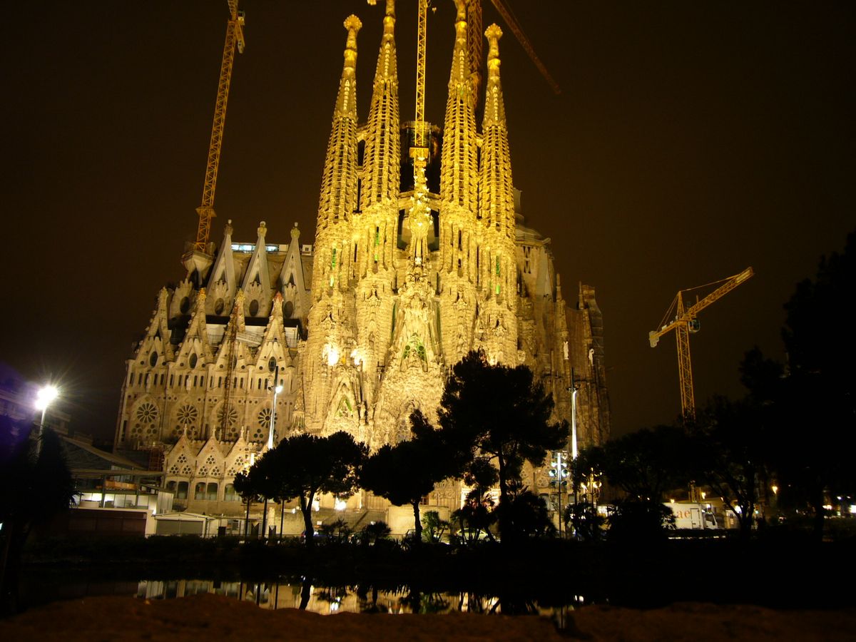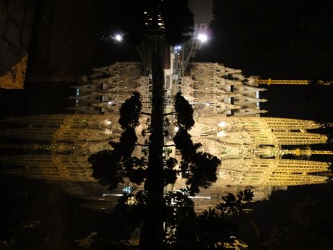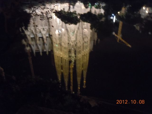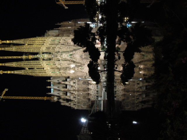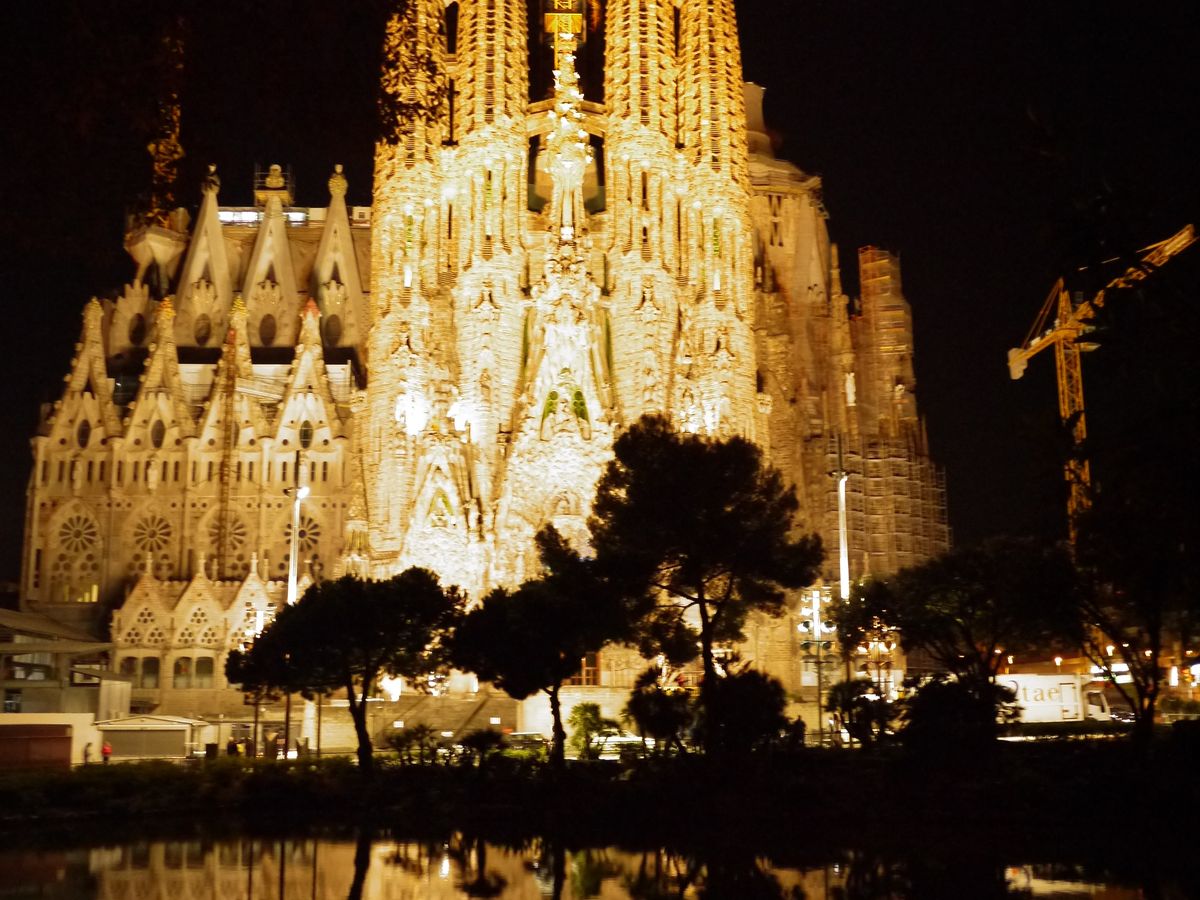 サグラダファミリアの夜景、水に映ったさかさまの夜景も素晴らしく短い滞在時間の中で貴重な体験ができました。