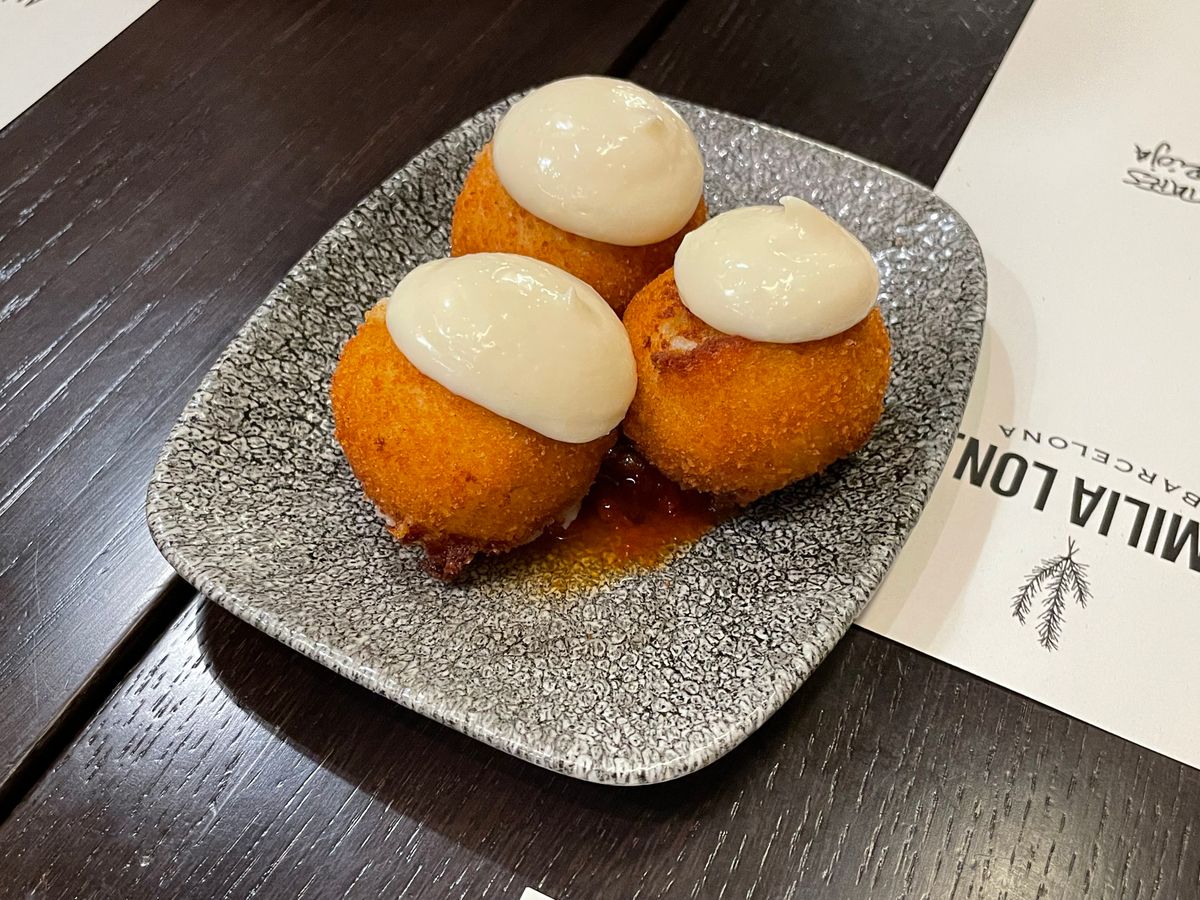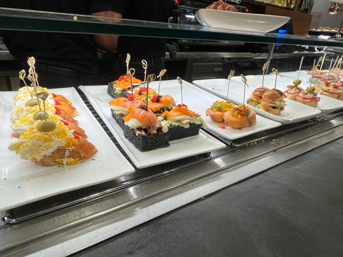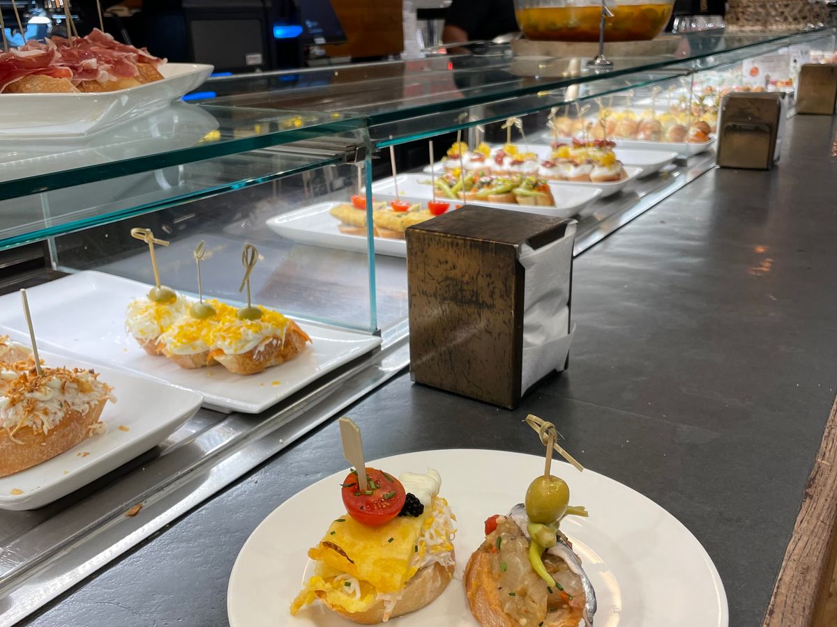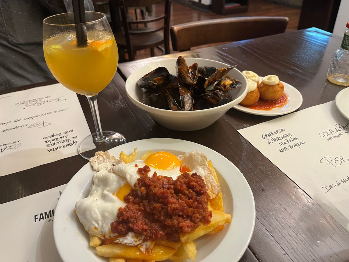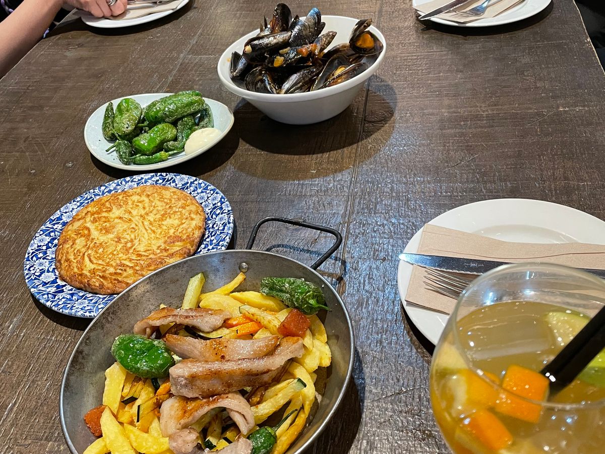 様々なタパスがメニューに並んでおり、色々食べたい欲があったので追加料金で1品追加しムール貝、バクダンコロッケ、サラミ・目玉焼きを混ぜたポテトを頼みました。スペイン語メニューでしたが、ガイドの方が一つずつ簡単に説明してくださり分かりやすかったです。