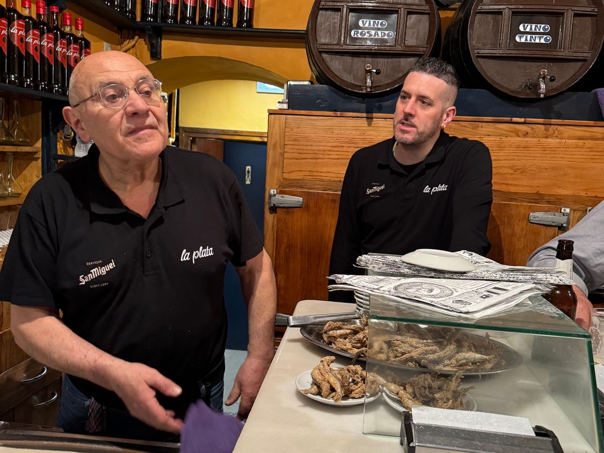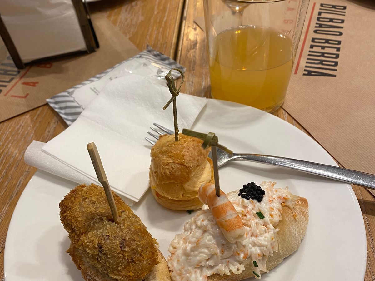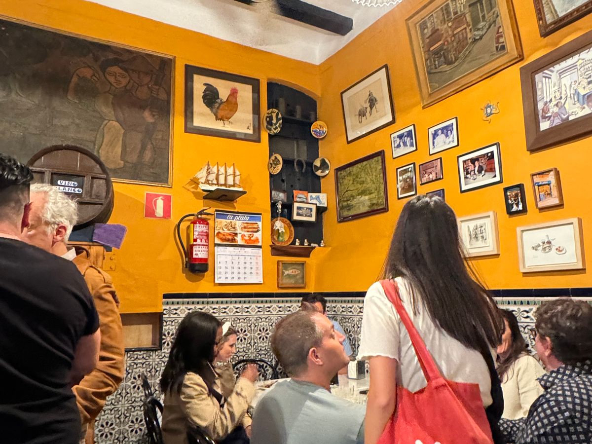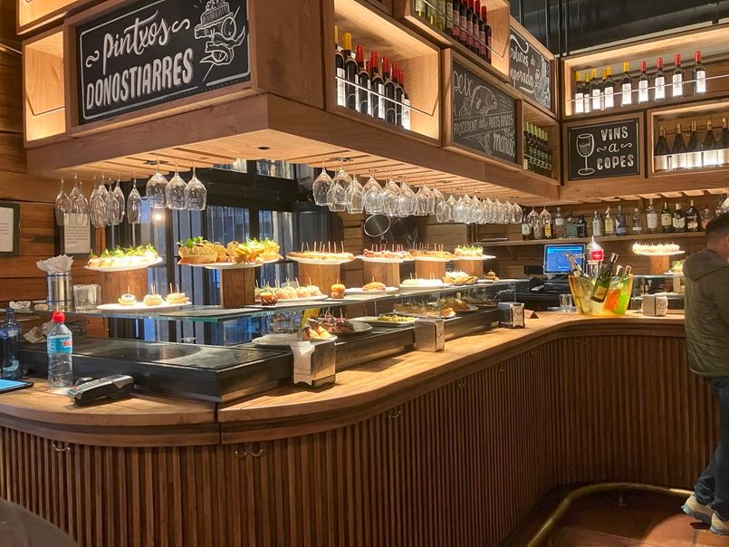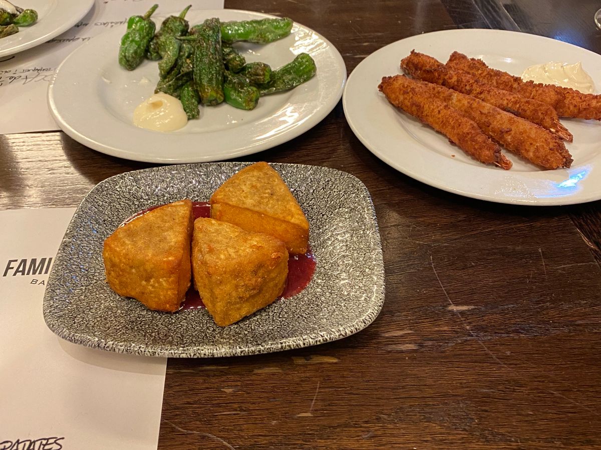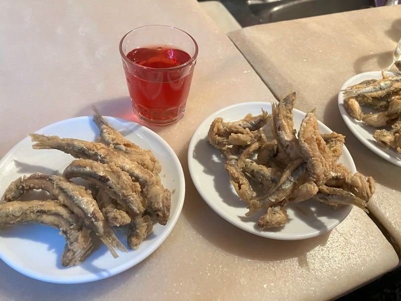 バル1軒目、イワシのフリットが名物のお店で大盛況、ガイドさんの誘導で混雑したお店に入店。お店の外で食べている人もいるほどの人気店のようです。