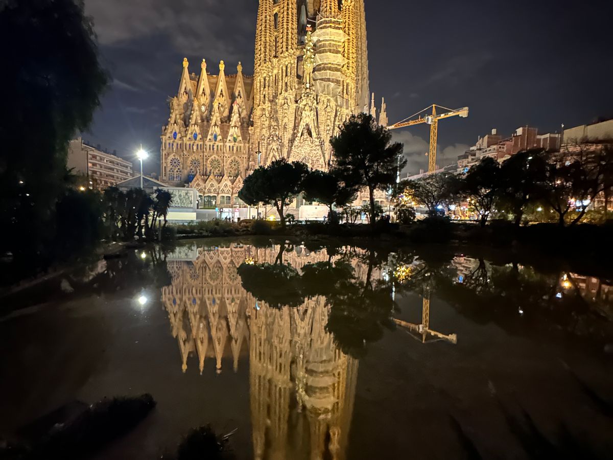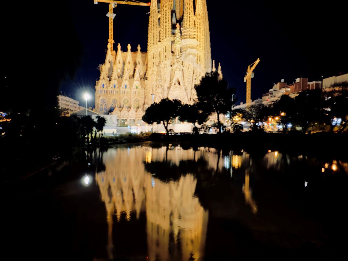 サグラダファミリアの夜の写真スポットも水面に浮かぶ素晴らしい写真がとれました。本当に美しかったです。