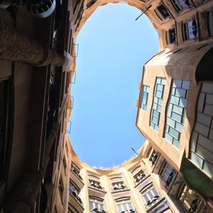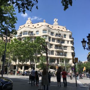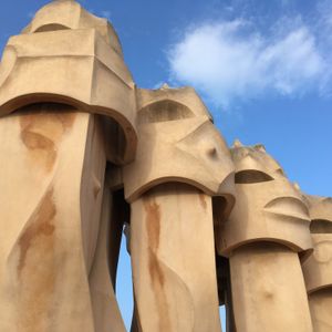 住居として今も使われていますが、すごく不思議な形をしています。外観はモンセラートの岩山からヒントを得たと言われています。入場し、見上げると吹き抜けから空が見えます。エレベーターで屋上に上がると、遊び心いっぱいの空間で、解放的になり、気分が高揚します。夜はプロジェクションマッピングと1杯のカヴァチケットがあるらしいですが、夏の夜なんかは最高だろうなと思います。屋根裏の資料館も興味深く見ました。建物は1フロアが1家族分の住まいになっており、吹き抜けをぐるりと囲むつくりで、家としてはとても広いと思います。グラシア通りに敷き詰められているブロックは、このカサミラ (現地の人はラペドレラと呼ぶ) の床のタイルのデザインをモチーフにしていますので、「あ、本物だ!」という感動がありました。個人的には階段にも直線がなく、曲線だけで構成されていることにも感動しました。