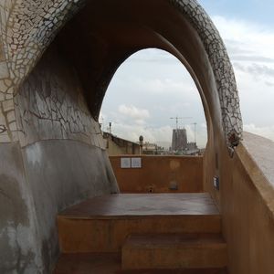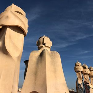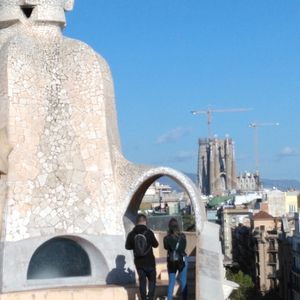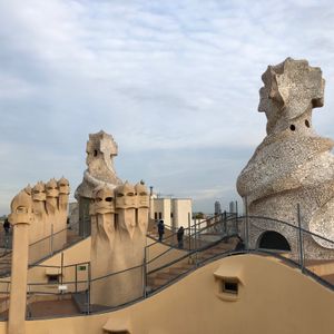 角を正面として右脇から入るんですが、その日は10月下旬の平日だからなのか、並んでいることもなく、スムーズに入場できました。ただチケット購入で並んで、手荷物検査で並んで・・・ってことを考えると、オンシーズンは予約しておくほうが安心だと思います。屋上にエレベータで上がって、林立する衛兵たちの煙突の間を通り抜けて、遠くにサグラダファミリアを眺めてきました。異空間へと誘われるちょっとした冒険です。