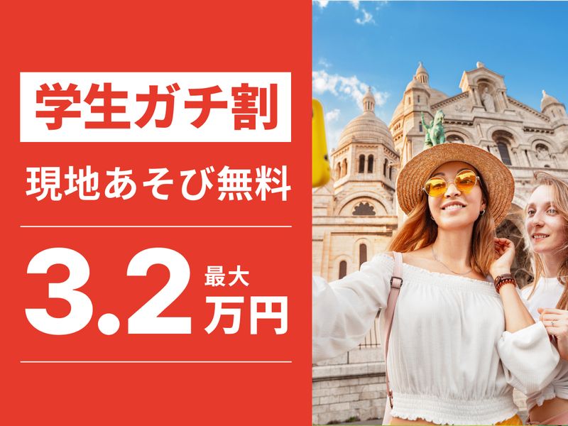 特典: 対象コース予約+学生証提示で、指定の現地ツアー(最大3.2万円相当)の無料予約権利を獲得!