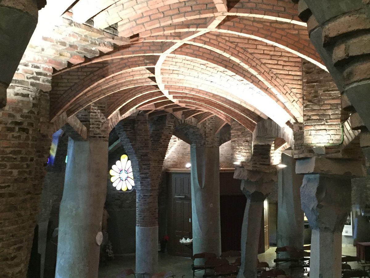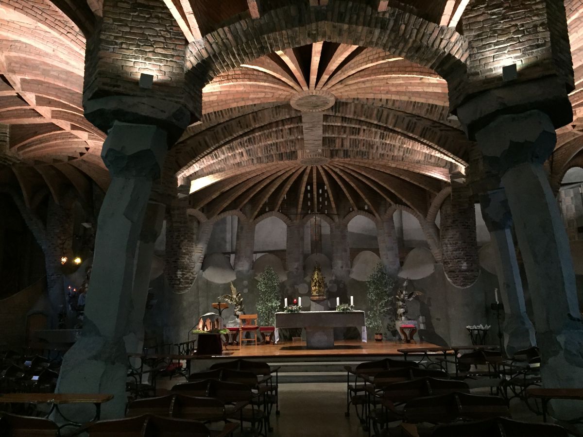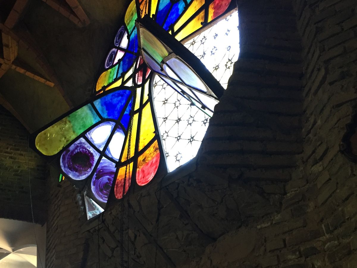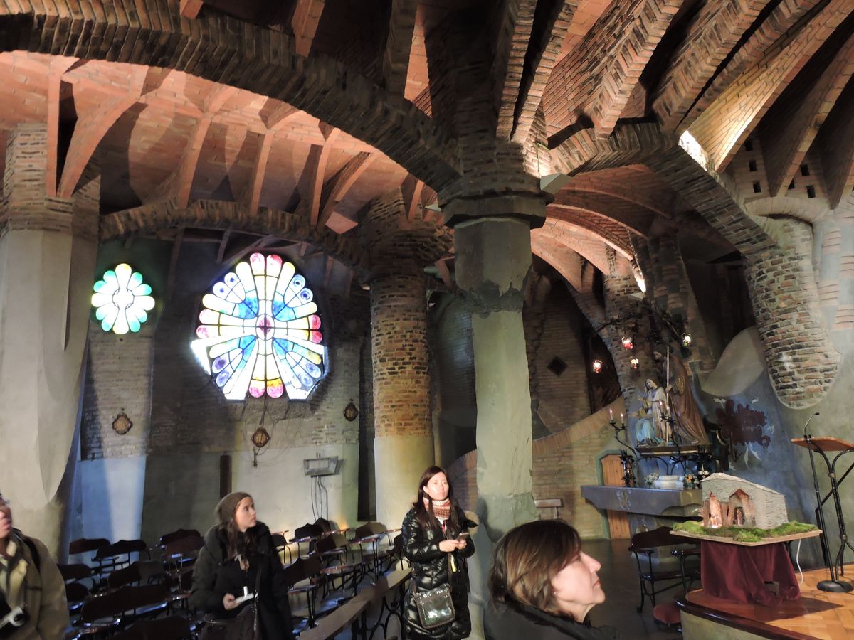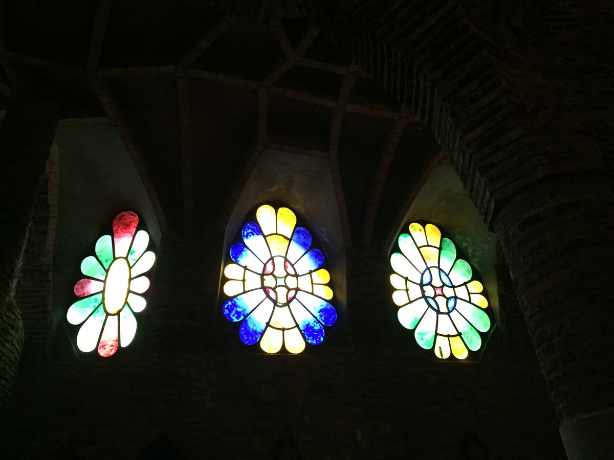 コロニア・グエル教会では、ステンドグラスにちょうど日が差し美しかったです。ステンドグラスは、開閉式になっているのですが、ある形になっており、よく考えられているデザインでした。