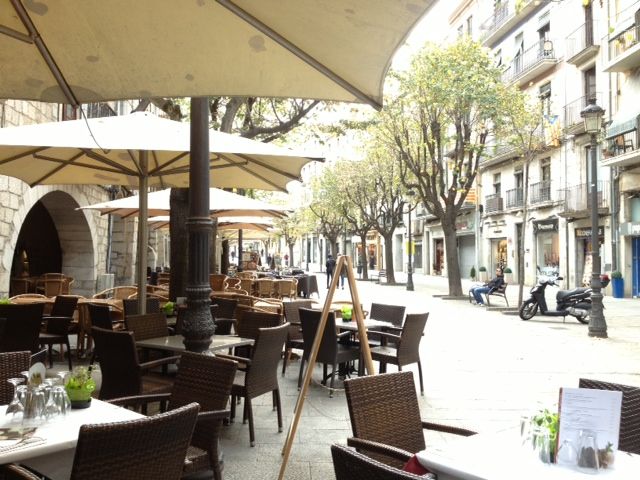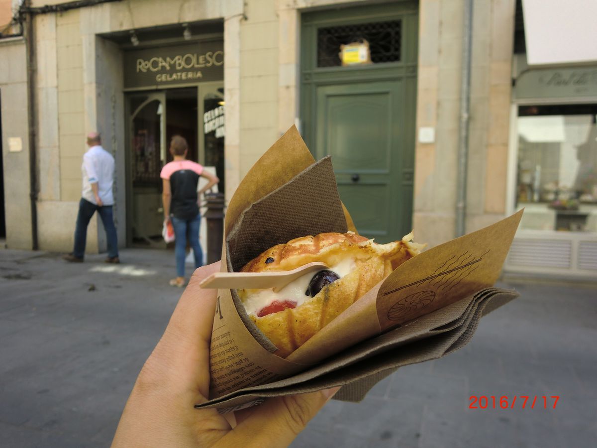 ジローナはほかの体験談にもあったように、ぶらぶらしてから、ランチをとるには自由行動の時間が短めでした。ガイドさんおすすめのアイスクリーム屋さんでパンケーキに挟まれたアイスを食べ、そのあとに独立広場にいくつかレストランやカフェがあるのですが、そのなかの一つのお店でピンチョスをつまみました。これがとても美味しかったです。
