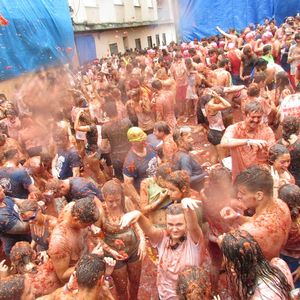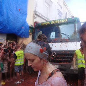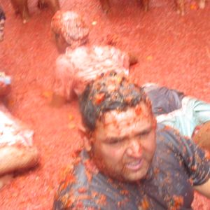 肝心のトマティーナですが、これは一生の思い出になるくらい、とても楽しかったです。激しさは想定内でしたが、女性にも容赦なく攻撃(それも笑いながら)してくるので、発狂してトマトを投げまくりました。会場の通りは一方通行でトマトを積んだバスが入ってくる方にスタンバイしていた方が、激しくトマトを投げれます。通りの終わりの方に行けば行くほどお祭り騒ぎが激しく、水やらお酒も混じっていたような。私達は最初フレッシュなトマトを投げ合い、徐々に移動していきました。最後は頭にすりこまれたり、背中からトマトを入れられたりトマトまみれになりました。