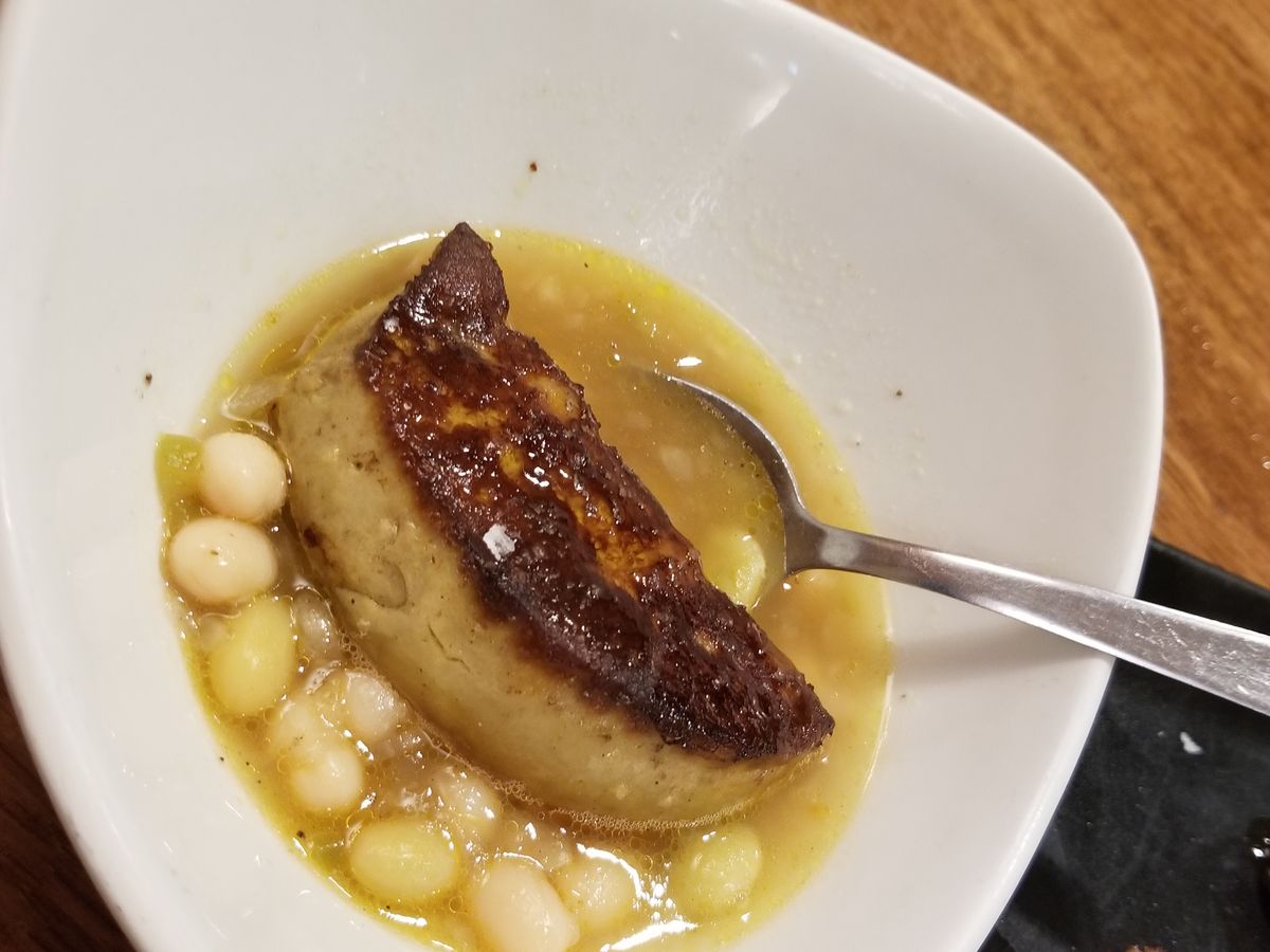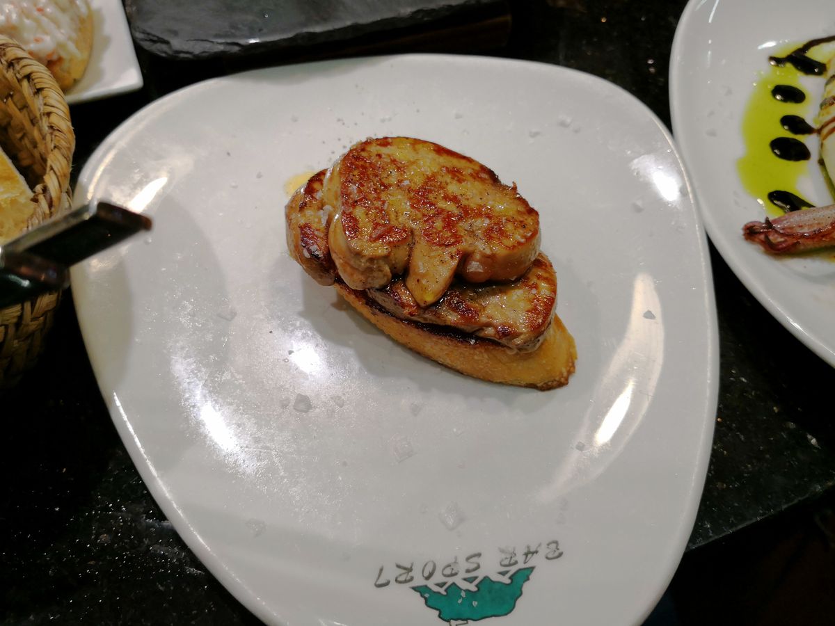 1軒目は Casa Urola に案内していただき、ビール(ここはチェコのピルスナーを置いています)とピンチョス4品(2×2人)をいただきましたが、ここはカウンターにはあまりピンチョスを置いておらず、多くは注文して作ってもらう方式です。フォアグラを使ったものなど、注文して作ってもらったものばかり4品いただきましたが、どれも皆美味しかったです。