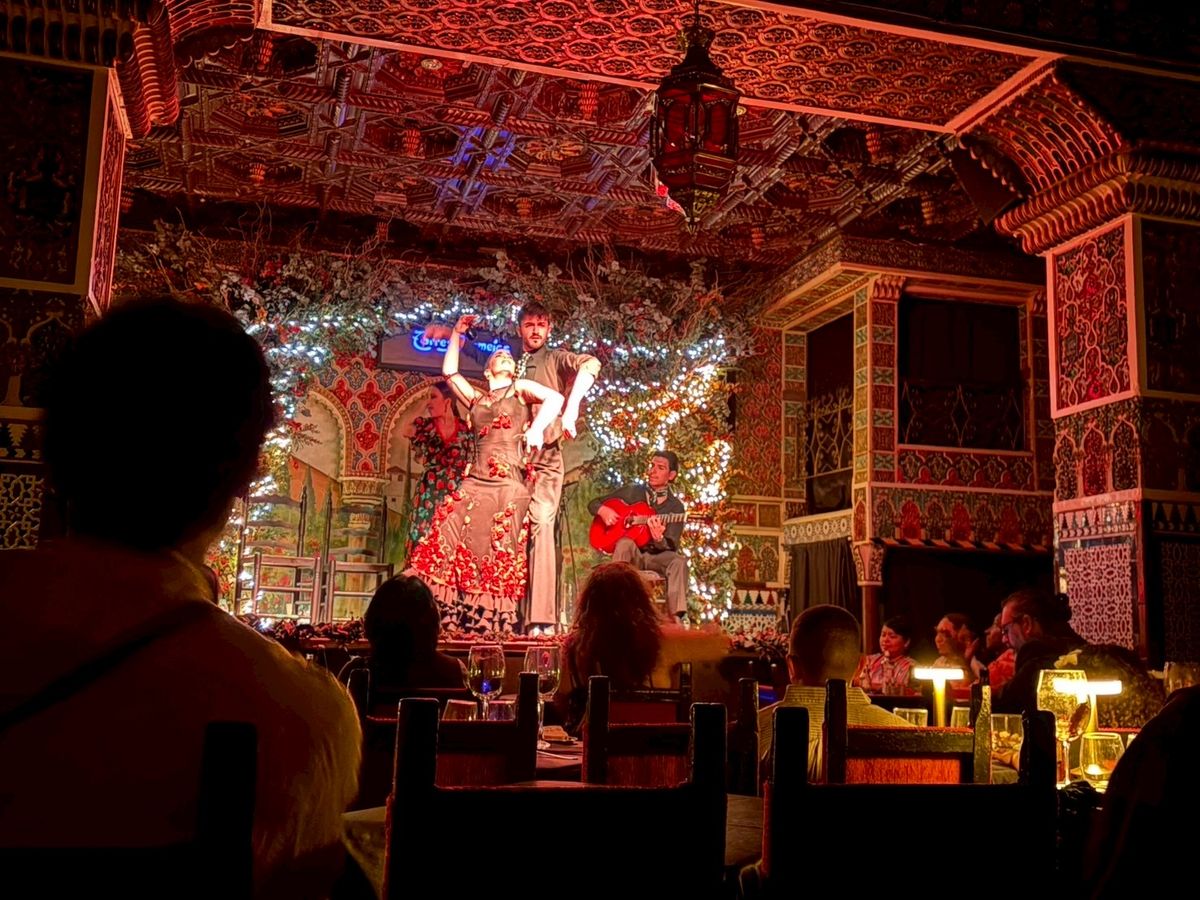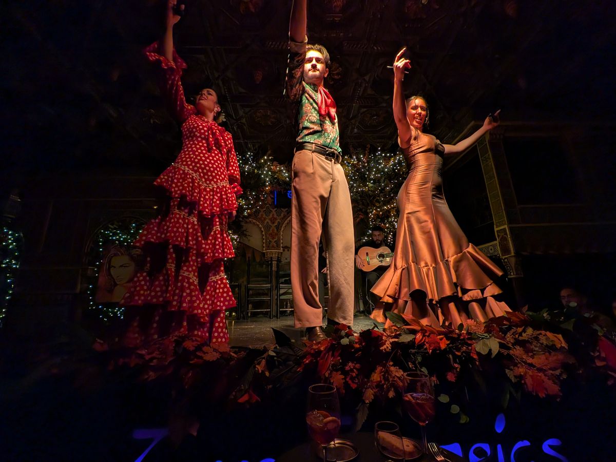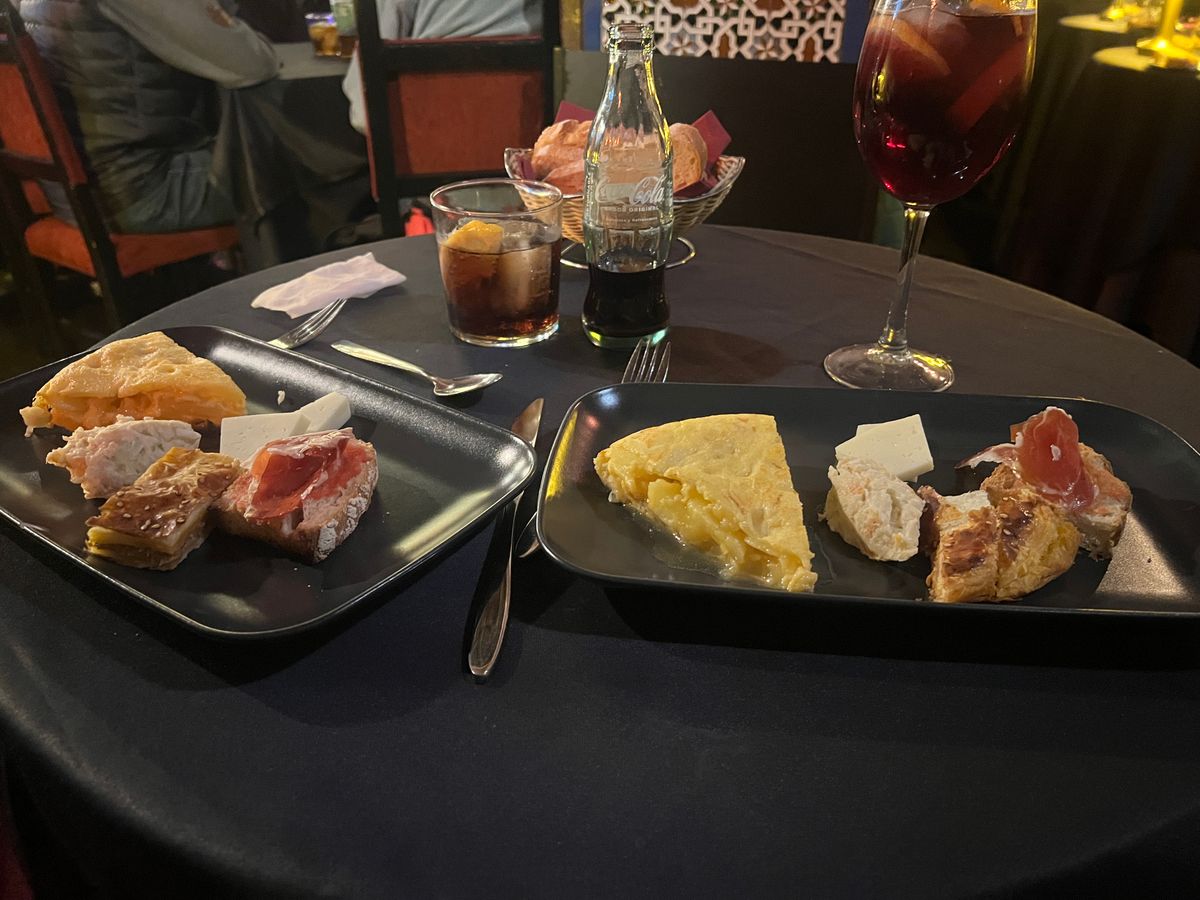 アンダルシア地方に行く時間は無いけど、せっかくスペインに来たのでフラメンコをみたいとなりこちらに。6時半開場とのことで向かうと、すでに行列が。並んでいると35分ぐらいに案内が始まりました。席は払ってるクラスごとで違うみたいで、タパスを頼んでいる自分たちは比較的正面前の方の良い席に。ただ、前から詰めていく方式なので、後から来た人はどんどん席が悪くなっているようでした。自分たちは2列目の端に案内されました。席に着くと、日本語が軽くできる店員さんから「赤ワイン、白ワイン、ビール、サングリア……」と聞かれ、すぐにタパスが運ばれてきました。他のレビューにもありましたが、タパスの量がとにかく多い。タパスって書いてあるのに、なぜかパエリアまで運ばれてくる始末。どうなっているんだ(褒めてる)。味はどれもとにかく美味しく、パエリアはちょっとしょっぱかったですが、本場の感じでした。内装はアルハンブラ宮殿のような雰囲気で、フラメンコが始まるととにかく迫力がすごい。ただ食事の量が多くて、食べて撮って見てととにかく大忙しでした。タパス以上の食事を検討している人はタパスで十分だと思います。とにかく素晴らしい体験ができました。