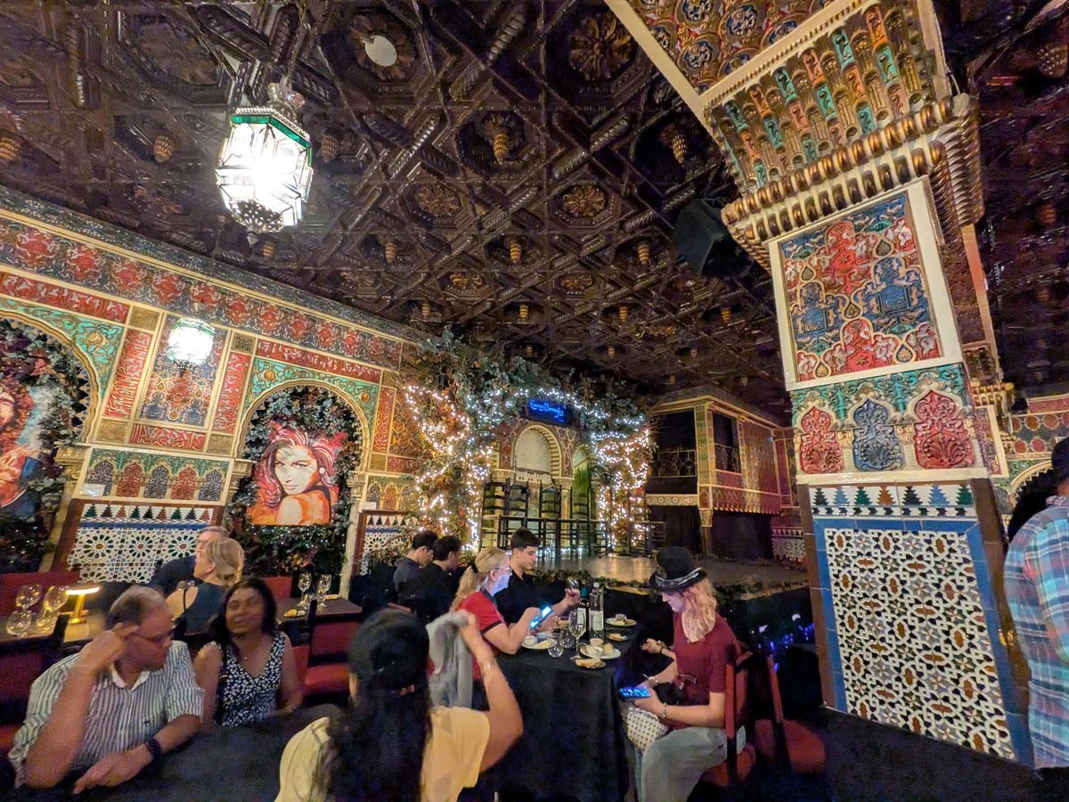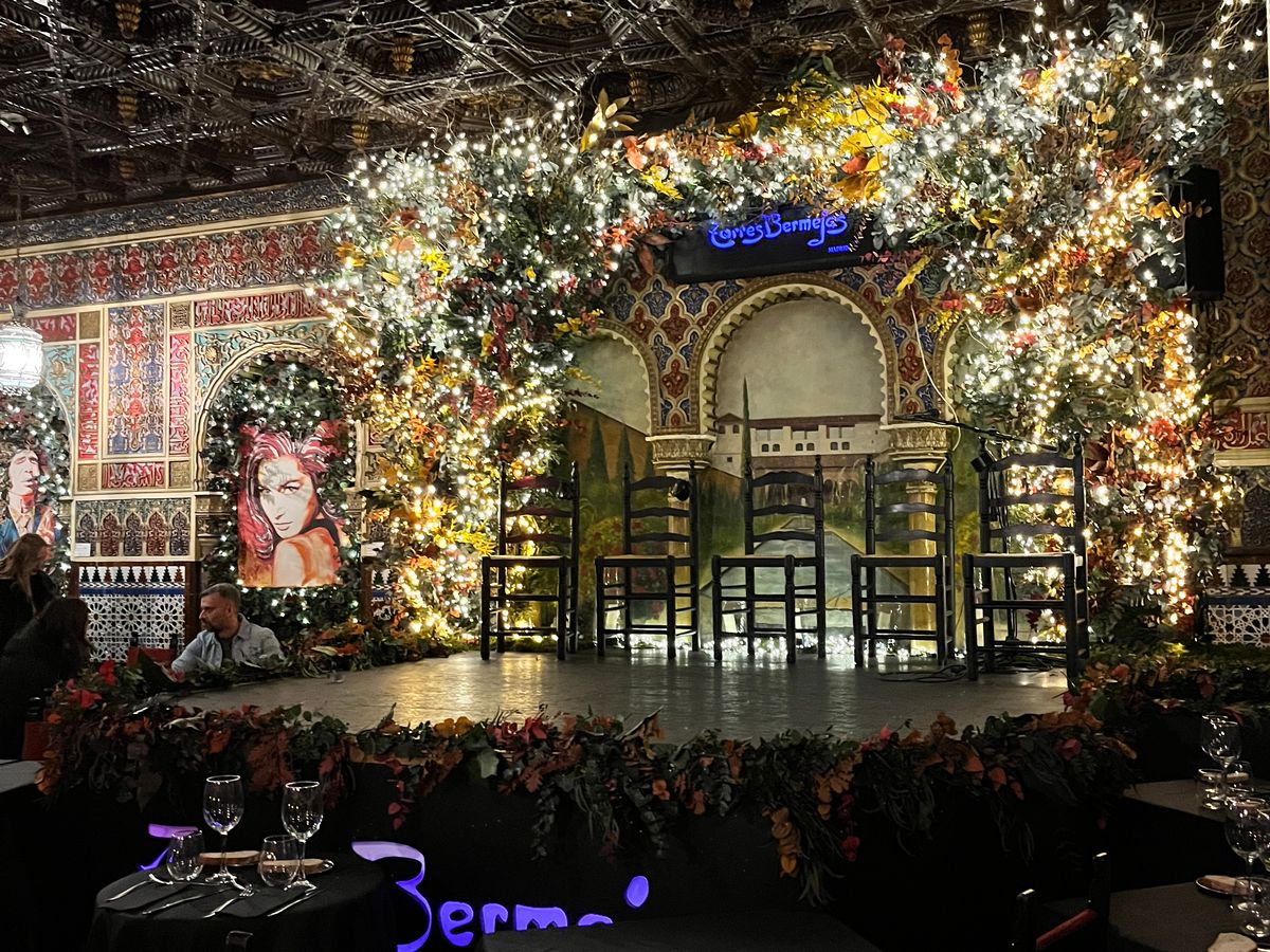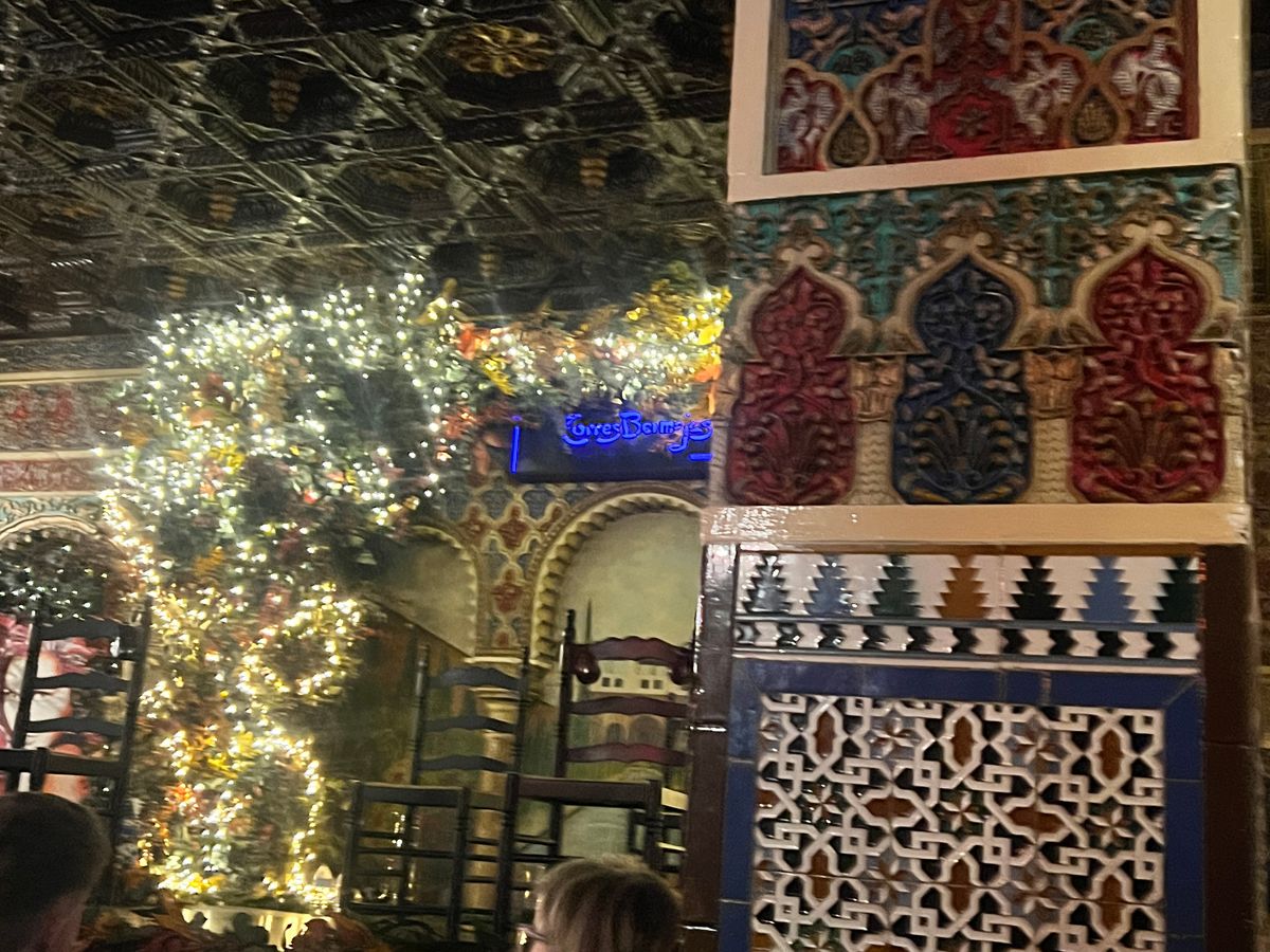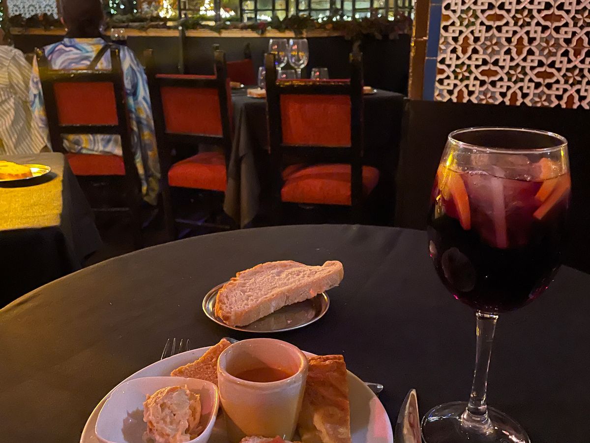 アンダルシア地方に行く時間は無いけど、せっかくスペインに来たのでフラメンコをみたいとなりこちらに。6時半開場とのことで向かうと、すでに行列が。並んでいると35分ぐらいに案内が始まりました。席は払ってるクラスごとで違うみたいで、タパスを頼んでいる自分たちは比較的正面前の方の良い席に。ただ、前から詰めていく方式なので、後から来た人はどんどん席が悪くなっているようでした。自分たちは2列目の端に案内されました。席に着くと、日本語が軽くできる店員さんから「赤ワイン、白ワイン、ビール、サングリア……」と聞かれ、すぐにタパスが運ばれてきました。他のレビューにもありましたが、タパスの量がとにかく多い。タパスって書いてあるのに、なぜかパエリアまで運ばれてくる始末。どうなっているんだ(褒めてる)。味はどれもとにかく美味しく、パエリアはちょっとしょっぱかったですが、本場の感じでした。内装はアルハンブラ宮殿のような雰囲気で、フラメンコが始まるととにかく迫力がすごい。ただ食事の量が多くて、食べて撮って見てととにかく大忙しでした。タパス以上の食事を検討している人はタパスで十分だと思います。とにかく素晴らしい体験ができました。