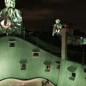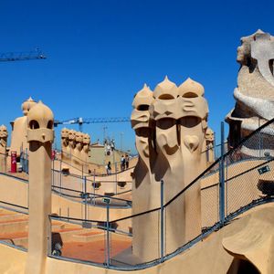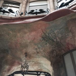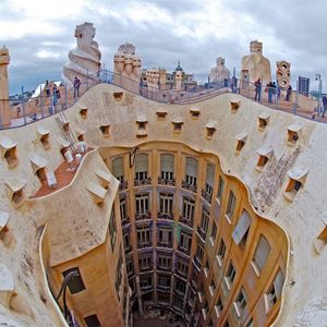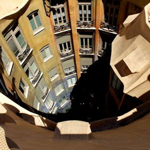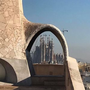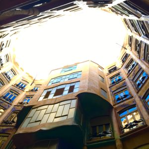 この建物を紹介する写真はたいがい正面からの外観ですが、「天才」を感じるのは内観や屋上、中庭など全てを見て、その一つ一つの凄さもさることながらそれらが全体で連関している事を悟った時です。やっぱり見学してこそ分かったわけで貴重な体験でした。私が行ったのは夕方で屋上に出るとそのユニークなデザインと近隣のモデルニスモ建築や遠くバルセロナ港まで続く建物群が夕暮れのオレンジと紫の空に映えて実に美しかったです。