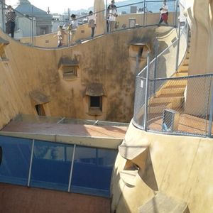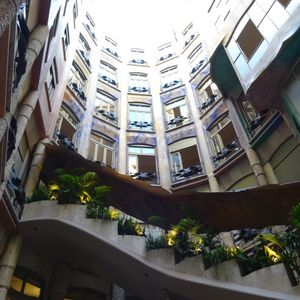 カサミラは、外観が工事中のためか、それほど並んではなかったですが、午前10時ころ行きました。もちろん優先入場できました。チケット売り場でチケットに交換してもらい、荷物検索を受け中へ。母がリュックを持っていたので入口入った先のロッカーに荷物を入れろと言われました。ロッカーは1€。後で戻ってきます。オーディオガイドはその先で借りて、エレベーターの列に並びました。実際に人が住んでる場所に観光客が入らないようにスタッフが所々に居ました。屋上がガウディらしく波のように上ったり下ったりしんどかったけど、見てよかったです。